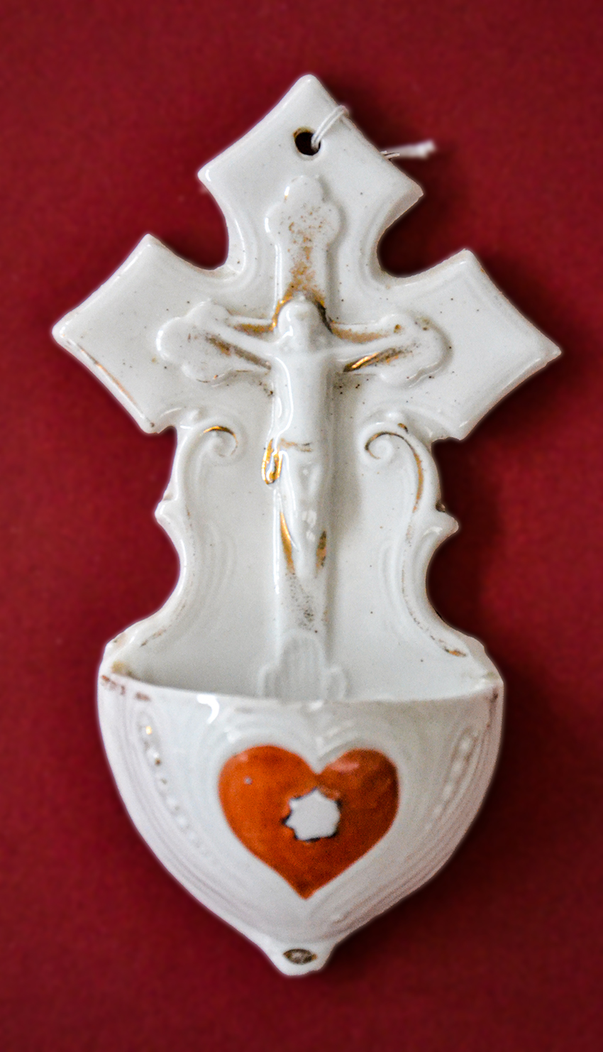 Acquasantiera in porcellana con Cristo in croce e sacro cuore