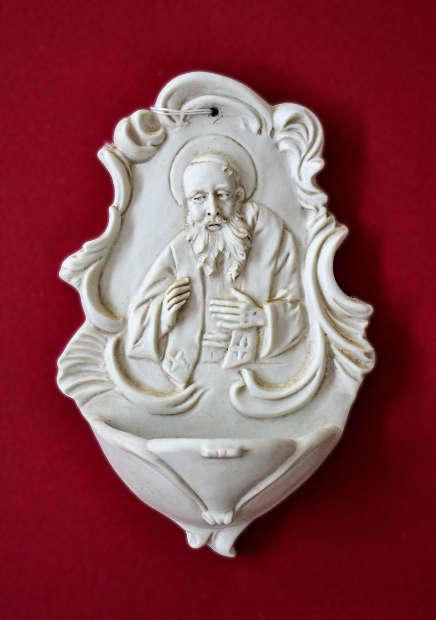 Acquasantiera in porcellana biscuit con santo