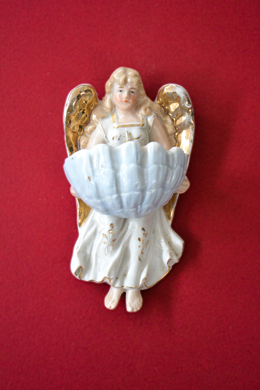 Acquasantiera in porcellana smaltata a forma di angelo (Francia)