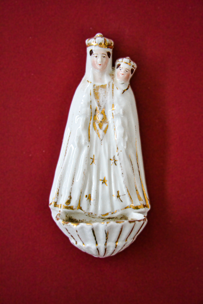 Acquasantiera in porcellana smaltata con Madonna con bambino