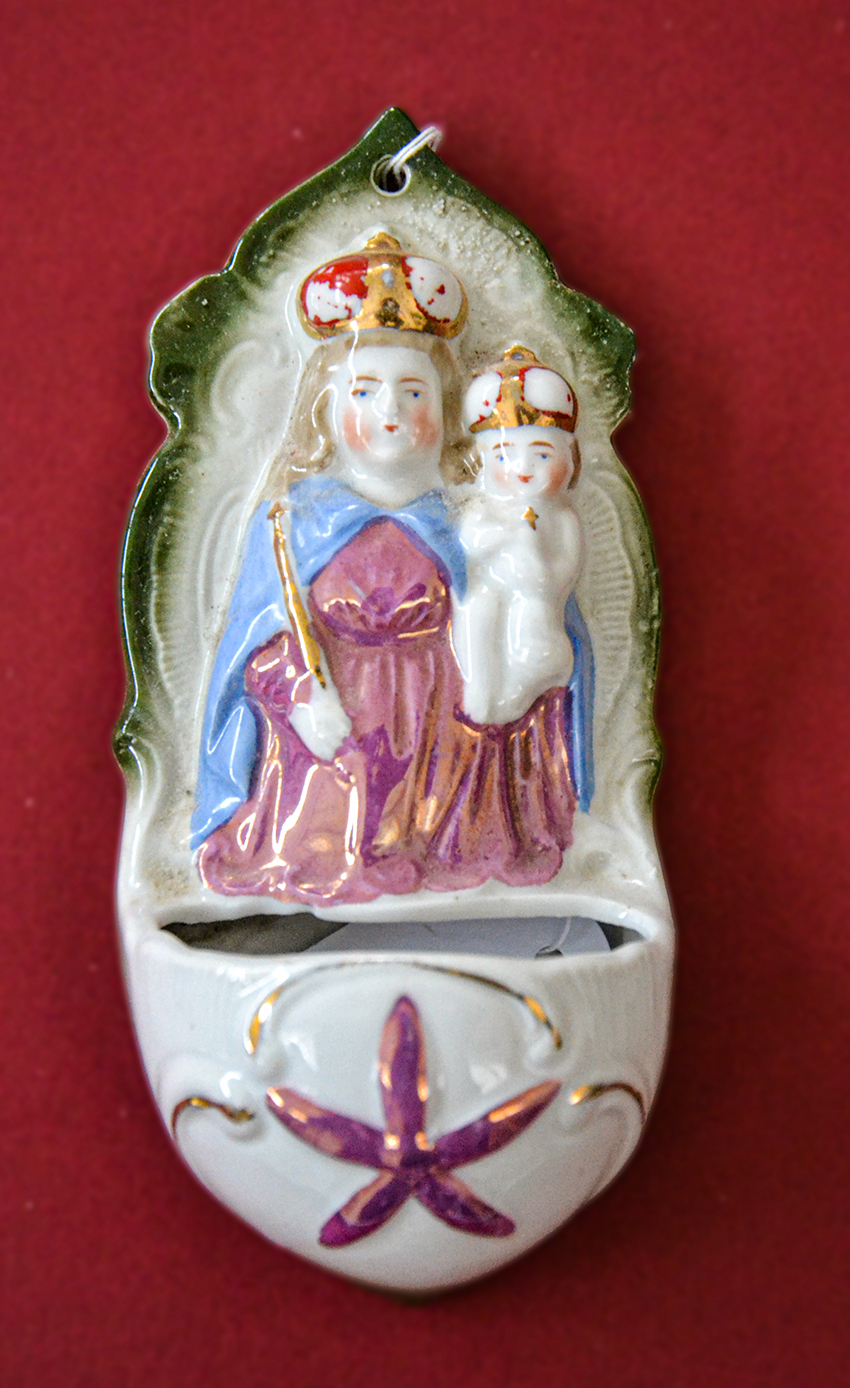 Acquasantiera in porcellana smaltata con Madonna con bambino