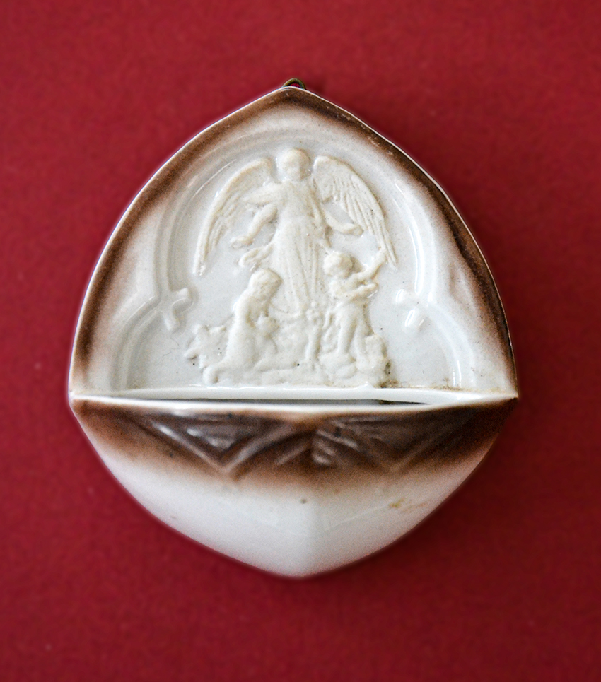 Acquasantiera in porcellana con arcangelo, Gesù e San Giovannino,
