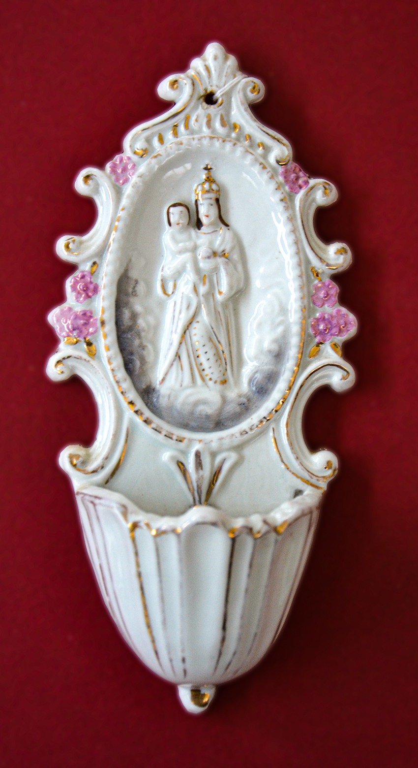 Acquasantiera in porcellana smaltata con Madonna con bambino