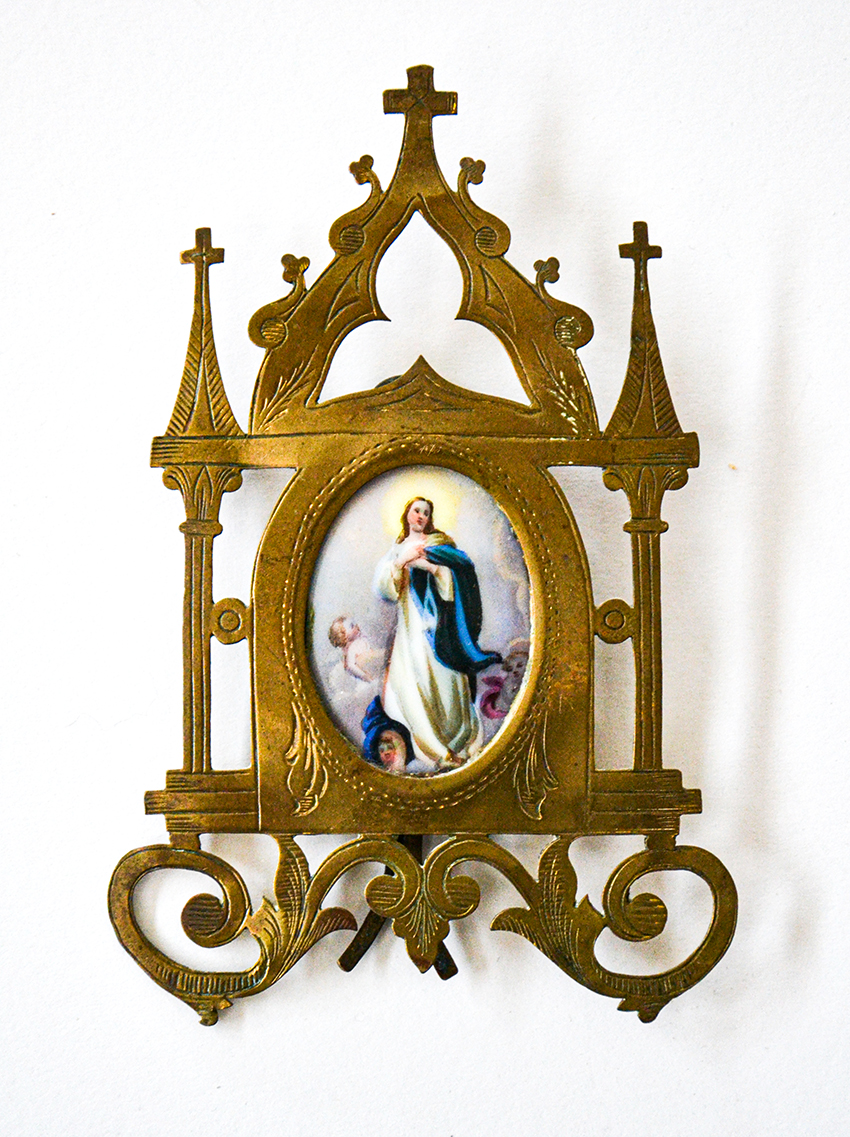 Miniatura su porcellana raffigurante Beata Vergine con cornice da appoggio in metallo dorato finemente cesellata