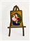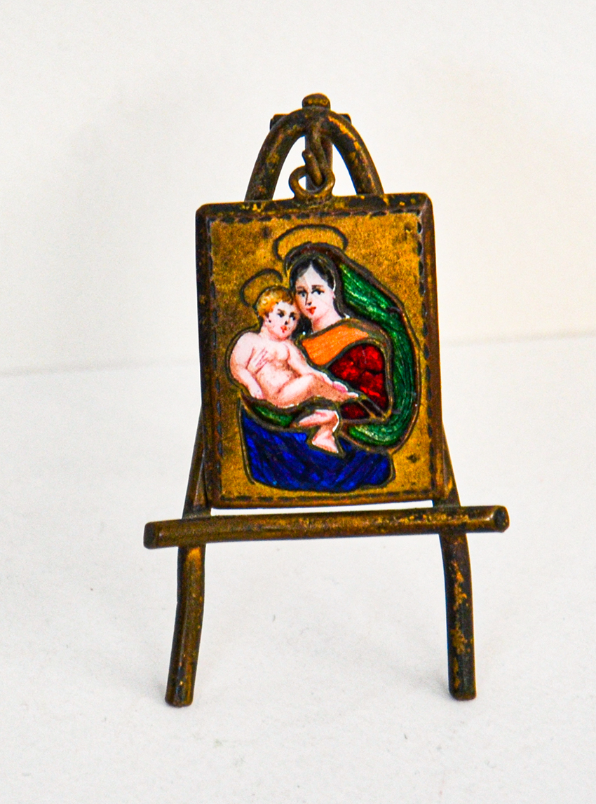 Medaglietta celebrativa in bronzo dipinta a mano con smalti policromi, raffigurante Madonna con Bambino.