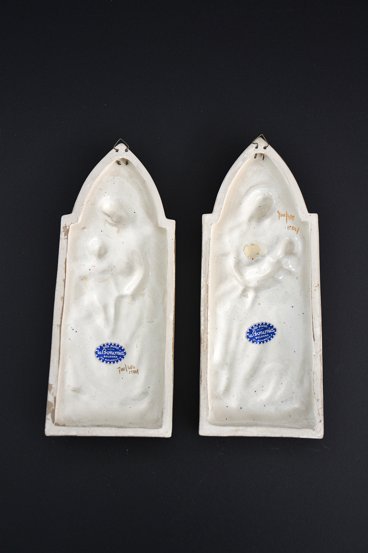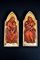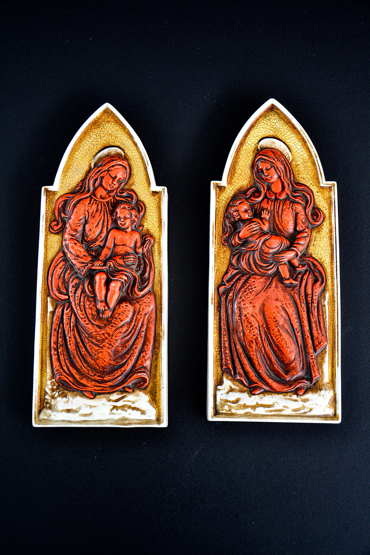 Lotto composto da due formelle in ceramica raffiguranti Madonna con Bambino dipinte a mano nei colori rosso su fondo oro craquelé, bordo a camice in rilievo bianco craquelé.