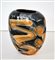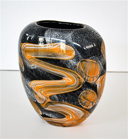 Vaso in pasta di vetro nero e cristallo trasparente marmorizzato nelle tonalità grigio/bianco e striature in murrina arancio/bianco.