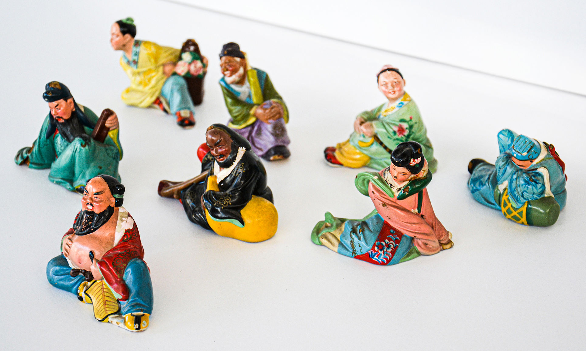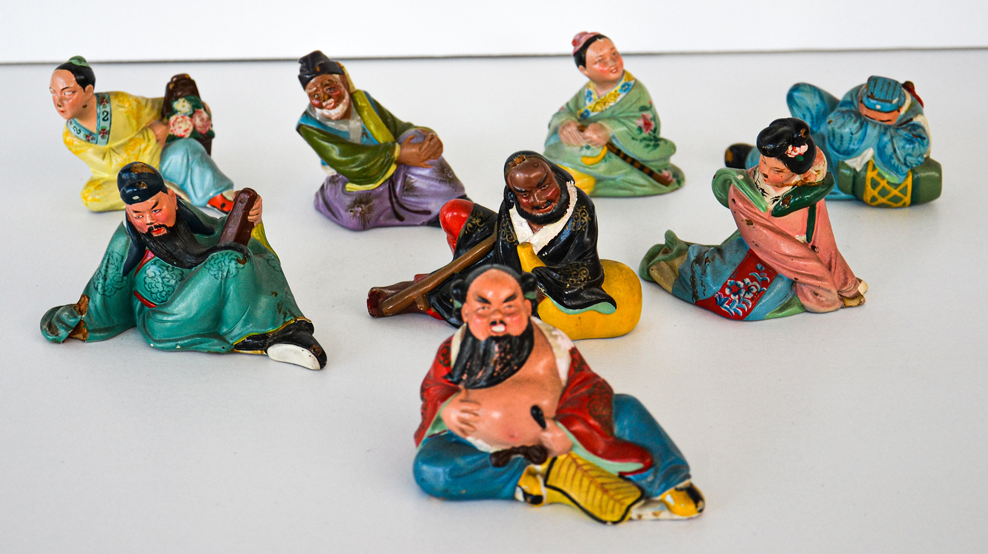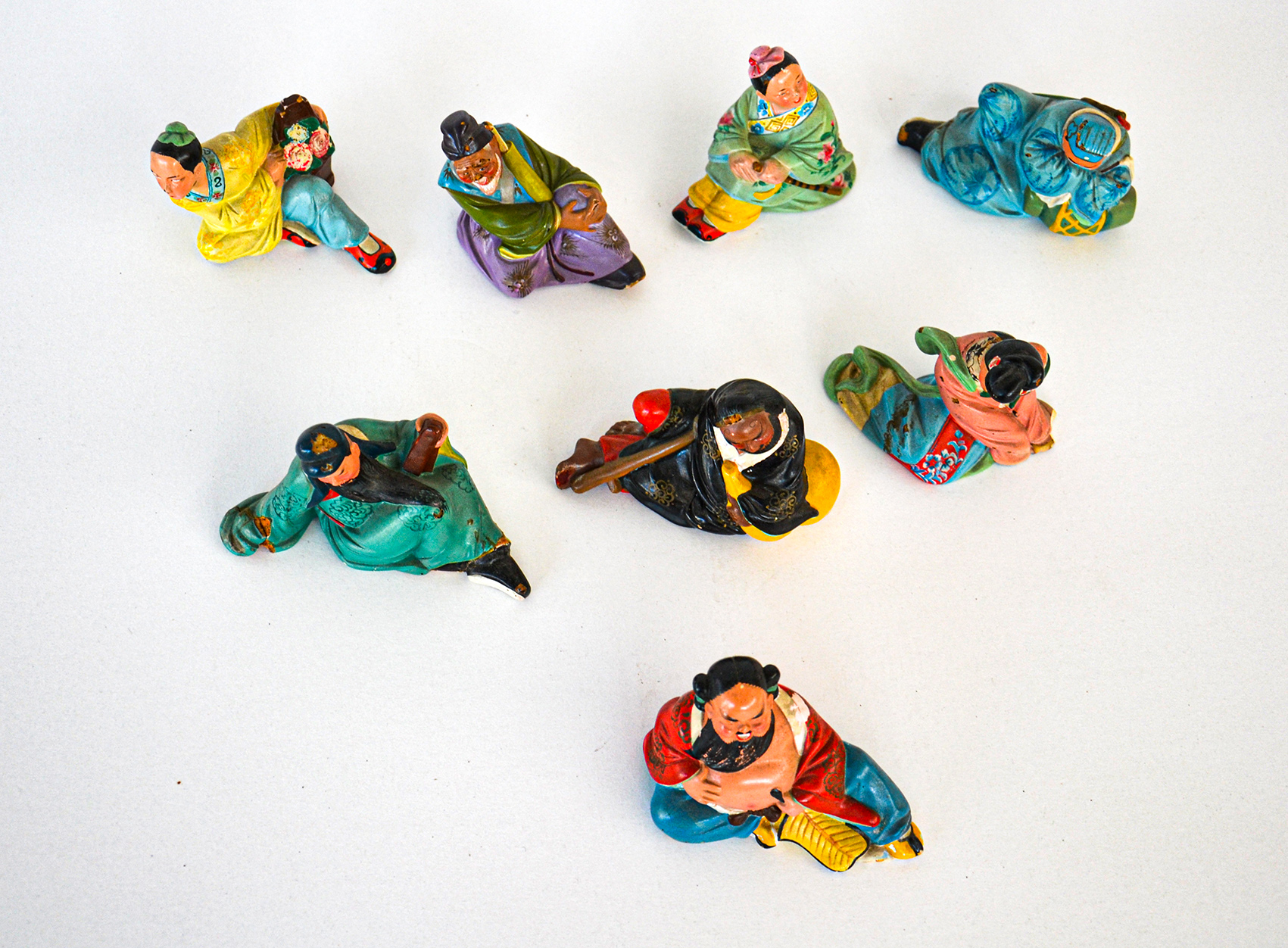 Otto statuine di figure maschili e femminili su temi popolari nell'arte antica cinese, realizzate in ceramica dipinta a mano con colori policromi opachi.
