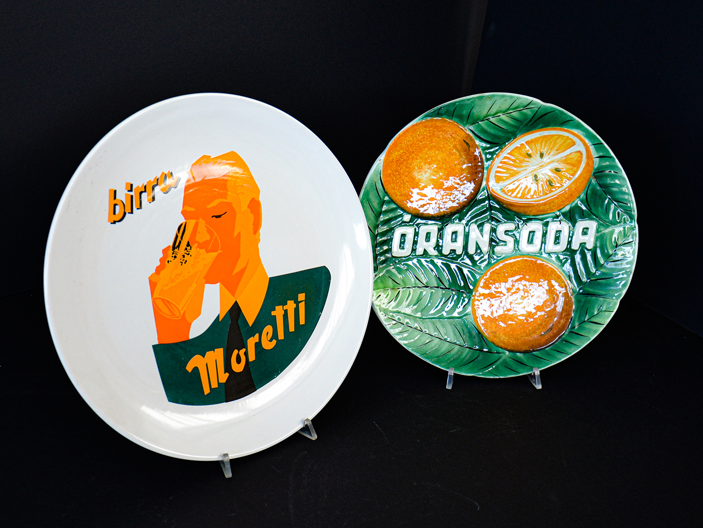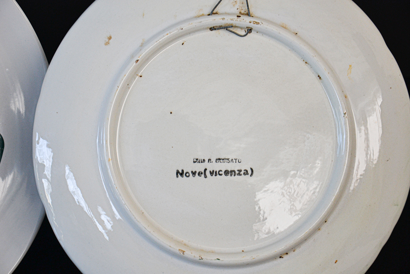 - Piatto "Oransoda" in ceramica bianca con immagine a rilievo e dipinto a mano. Sul retro è presentela scritta: Ditta Borsato Nove (Vicenza). Diam. 27 cm