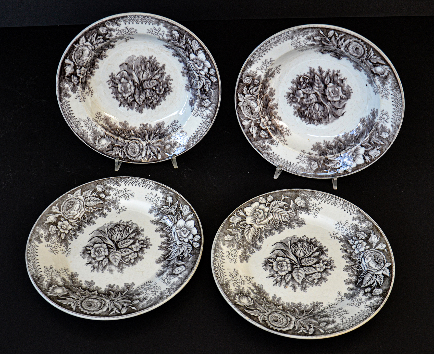 Lotto composto da due coppie (piano e fondo) di piatti in terraglia dura prodotti dalla Soc. Cer. Richard con decoro "Giardiniera" apposto per mezzo di calcografia in bruno scuro.