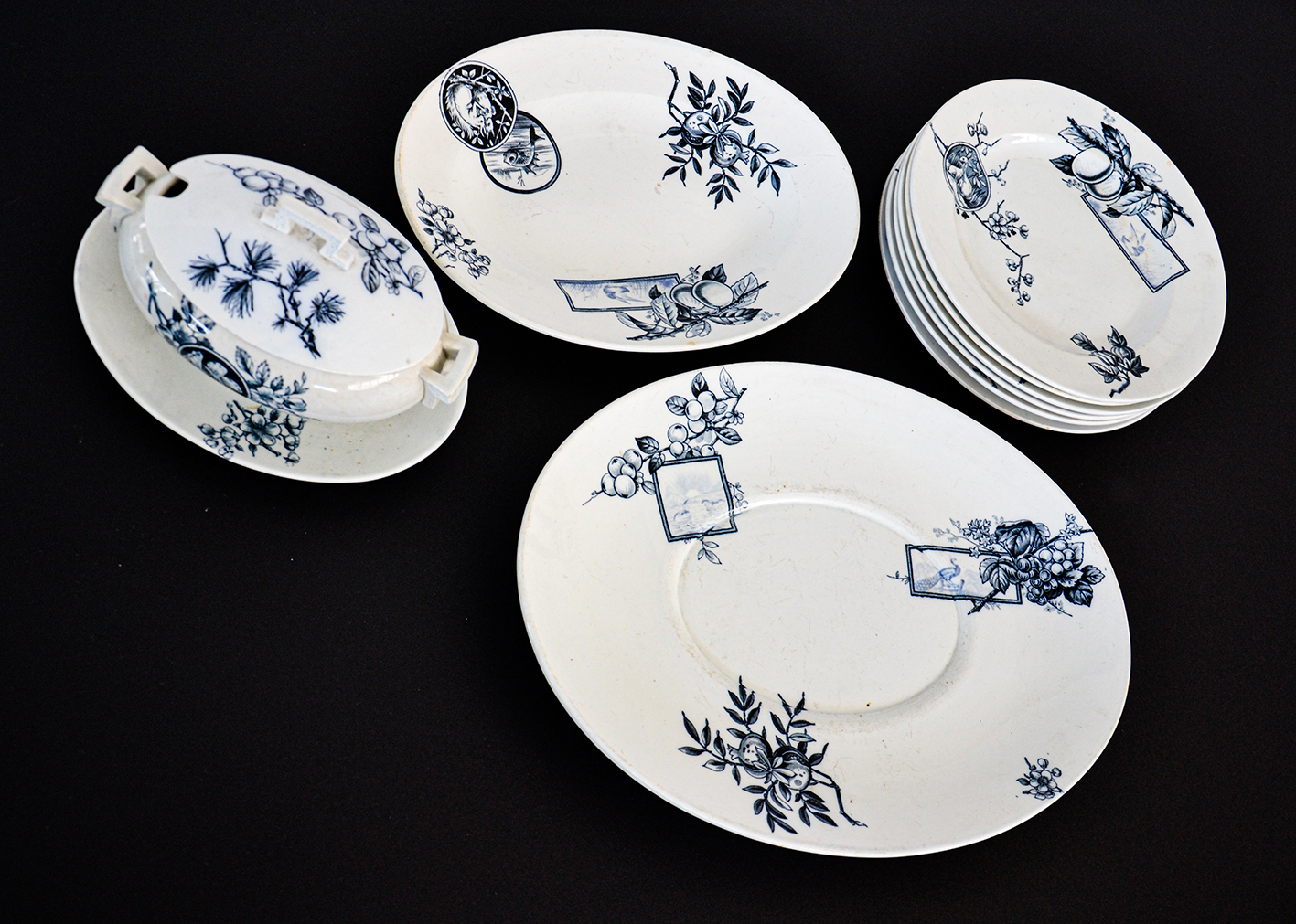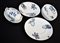 Servizio di piatti in ceramica bianca con decori blu a motivi floreali, vegetali e animali, composto da: