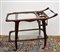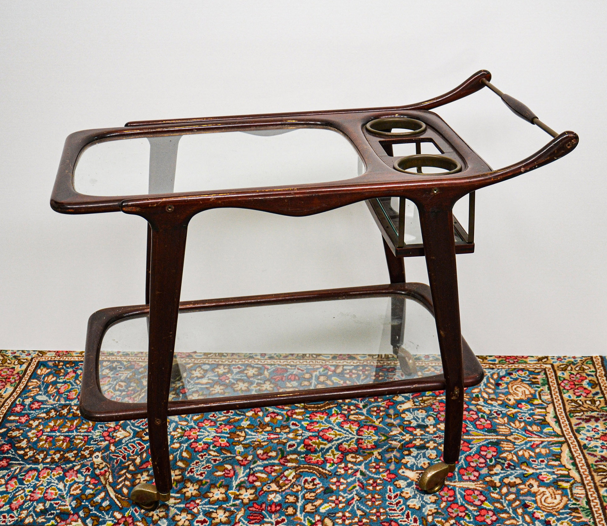 Carrello bar a due piani con portabottiglie, stile Ico Parisi, in legno di faggio tinto mogano e piani in vetro, con maniglia in legno e ruote in ottone dorato.