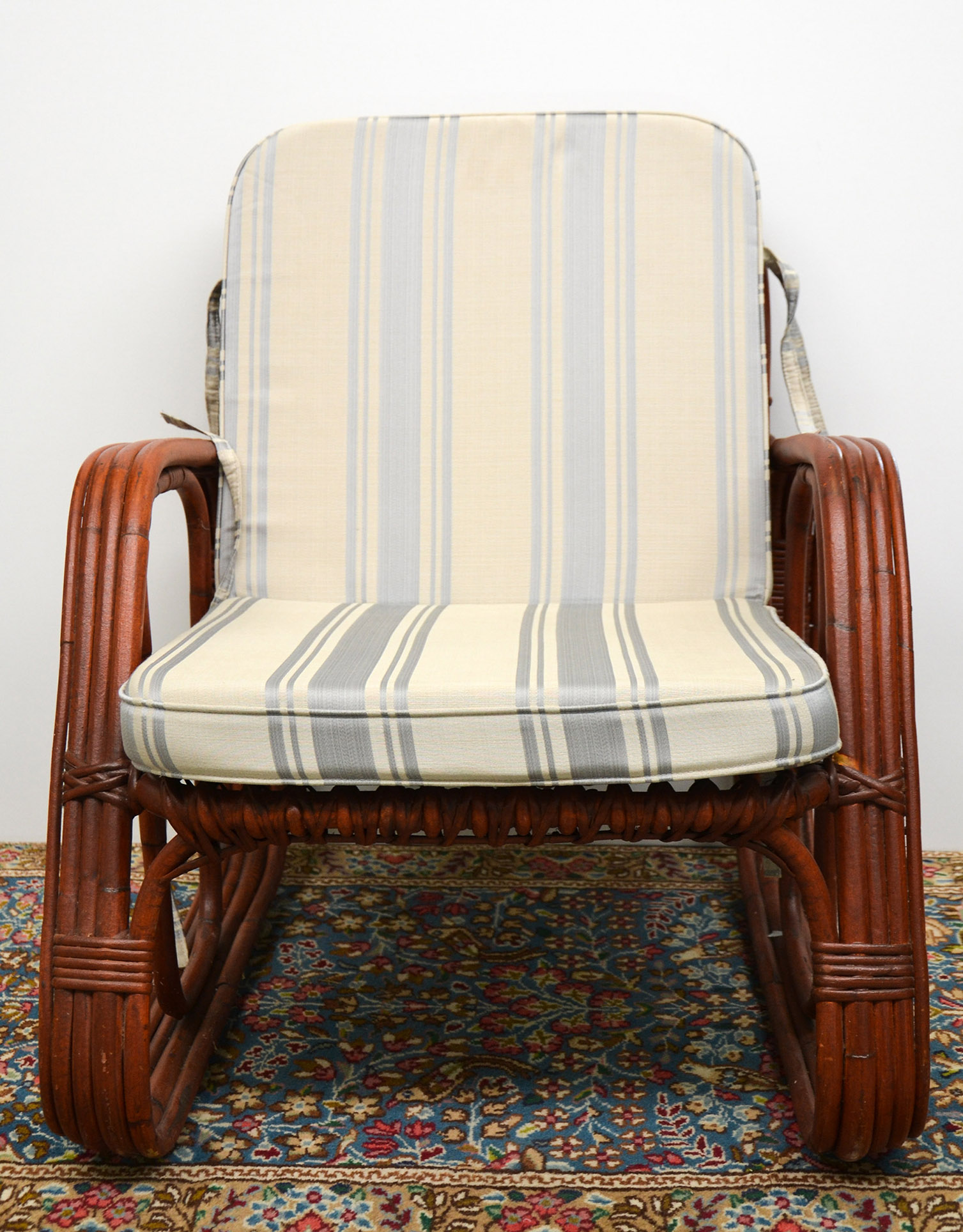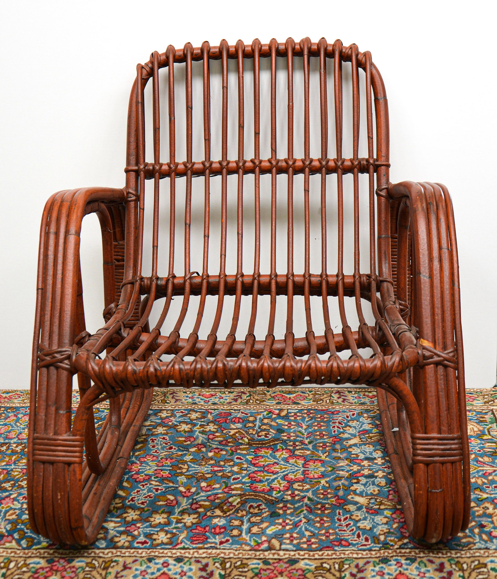 Poltrona contraddistinta dal robusto intersecarsi di tronchi di bamboo legati da certosini e fitti intrecci lavorati manualmente, produzione Bonacina degli anni ’60 – ’70.