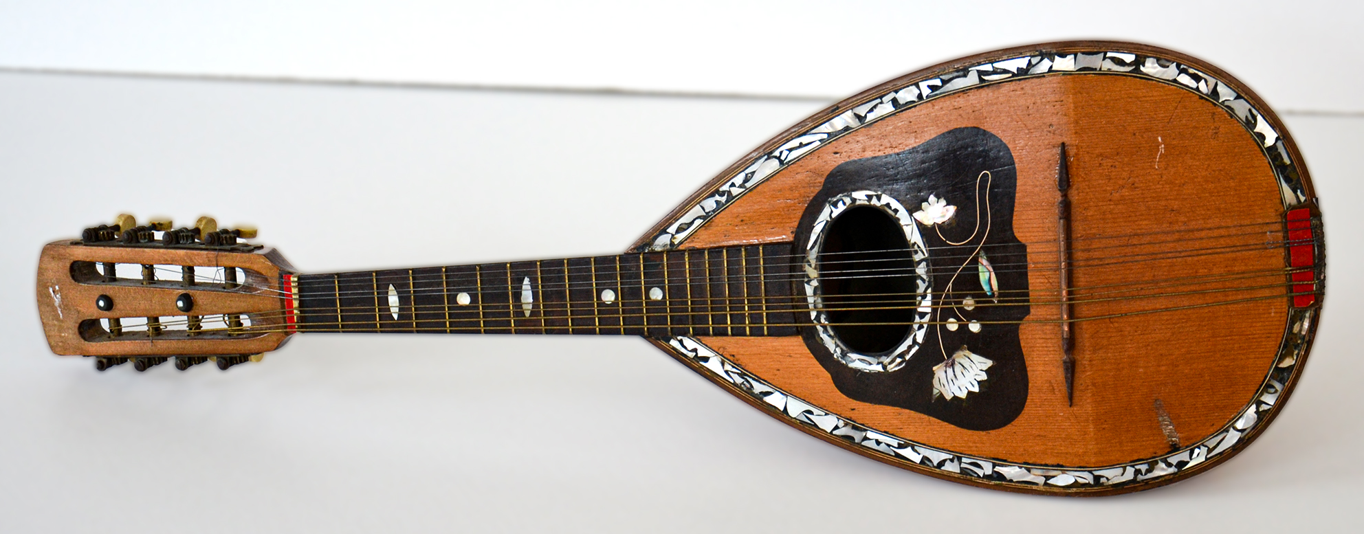 Mandolino napoletano a firma Luigi Mozzani, in legno intarsiato e decorato con intarsi ad elementi floreali in madreperla stile Liberty.