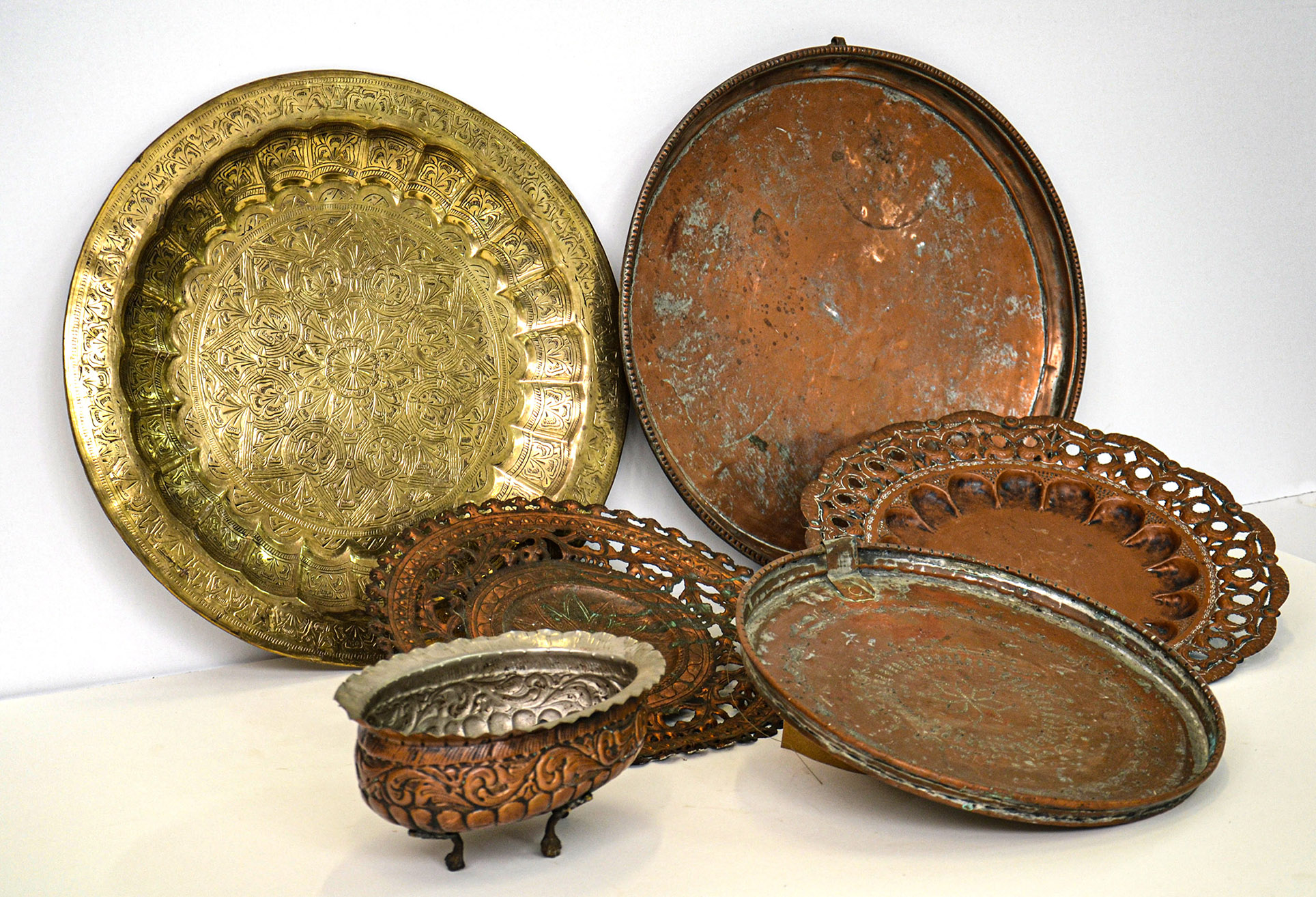 Lotto composto da un'alzatina e cinque piatti in rame cesellato di varie fogge e dimensioni.
