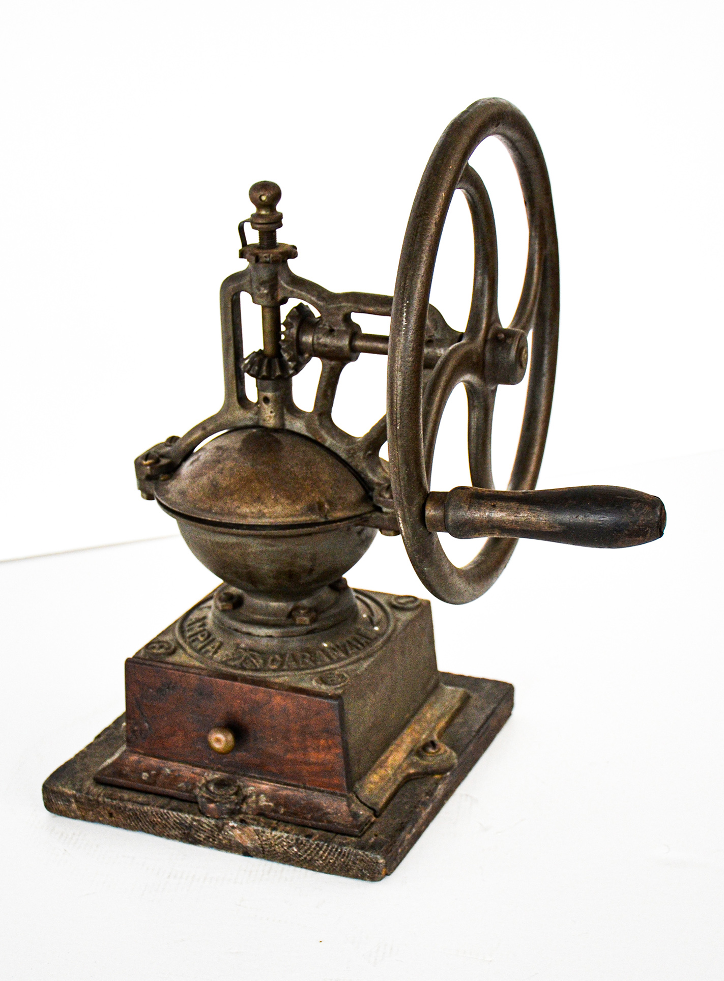 Macinino da banco in ghisa con cassetto in legno, ruota volano diametro 28 cm, coppa tramoggia semisferica in lamiera.