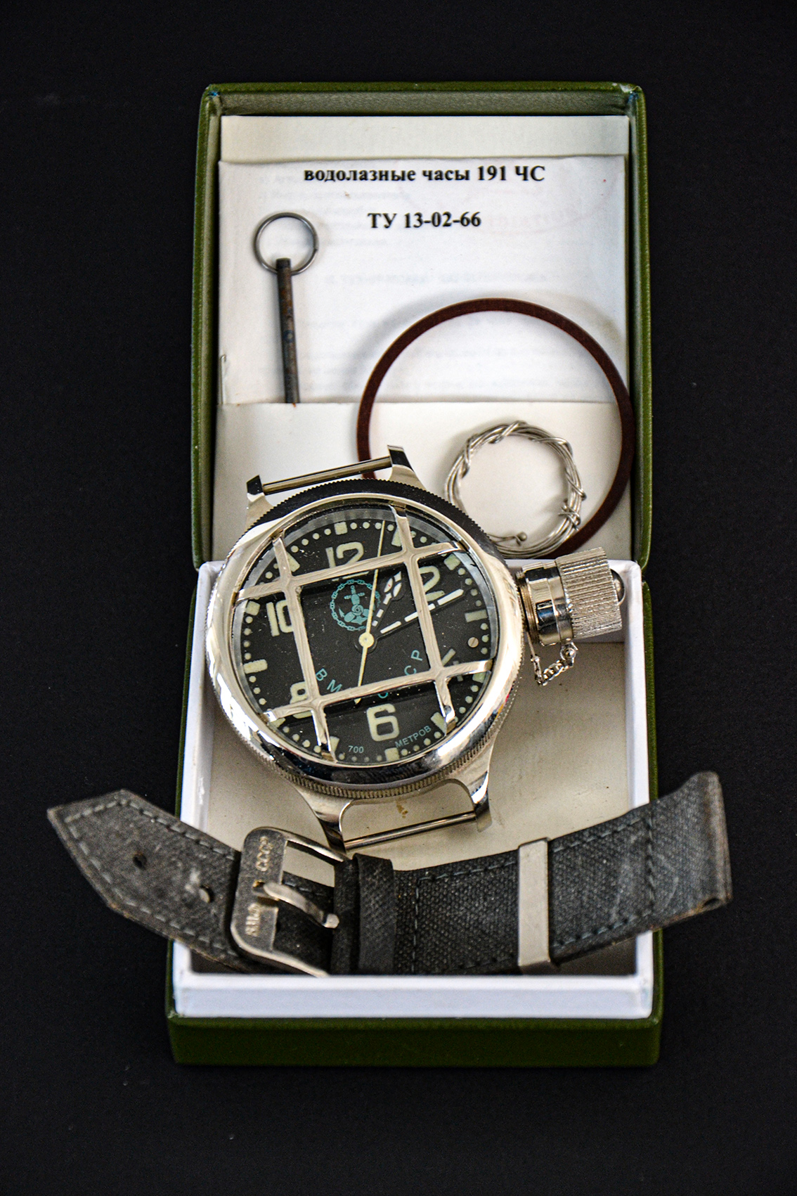 Dotazione originale degli anni '60/'70 dei palombari militari russi, orologio di grandi dimensioni con cassa in uranio impoverito non radioattivo, spessa 3 centimetri e larga 6, con griglia di protezione del vetro.