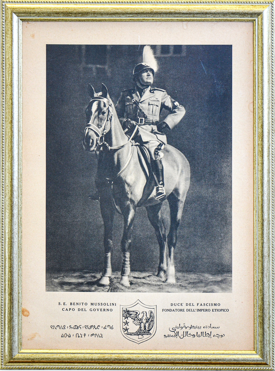 In basso la didascalia con stemma centrale con aquila e fascio littorio diciture in italiano e etiope.