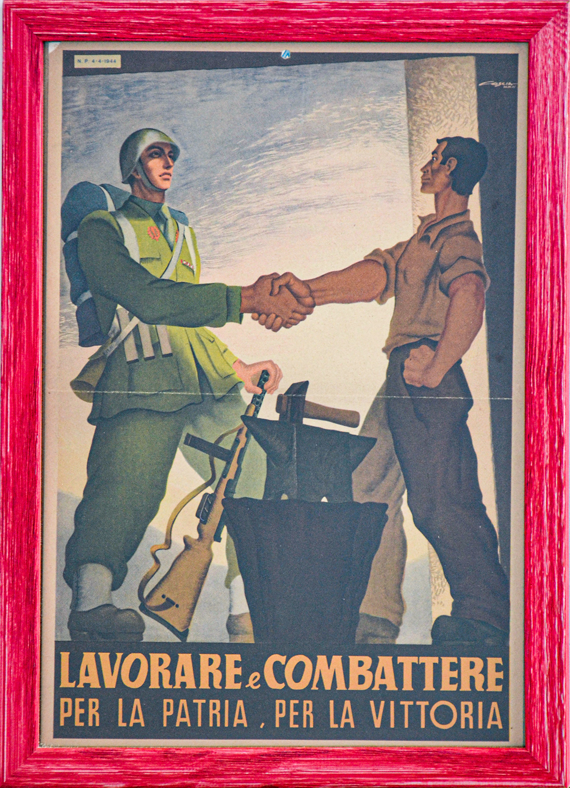 Riproduzione del manifesto illustrato da Dante Coscia nel 1944, "LAVORARE E COMBATTERE" a favore della propaganda della Repubblica Sociale Italiana.