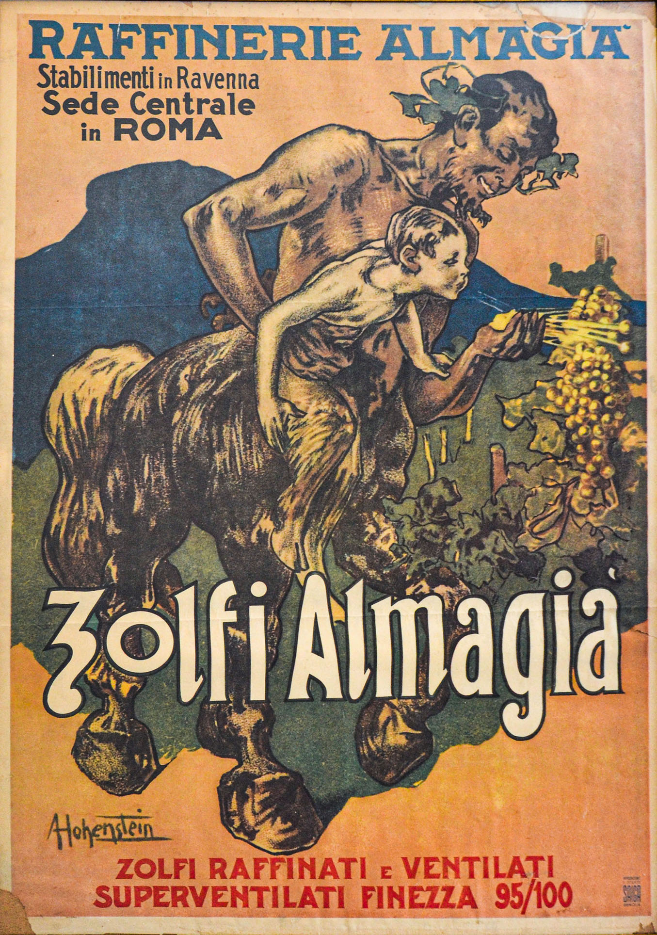 Manifesto "Zolfi Almagià" delle Raffinerie Almagià in Ravenna, illustrato da Hohenstein e pubblicato da SAIGA nel 1950.
