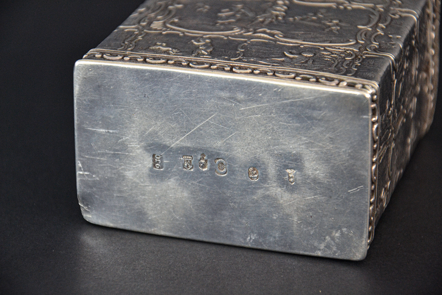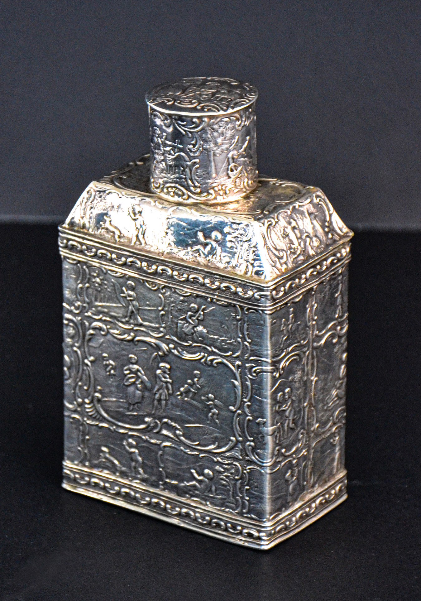 Tea box olandese in argento sbalzato e cesellato con scene agresti e putti. Importato e immesso sul mercato inglese. Sono presenti due serie di punzoni: una riconducibile a pseudo punzoni antichi apposti dall’argentiere olandese Hooijkaas sul fondo della bottiglia e l’altra serie sul collo della bottiglia riconducibile all’argentiere londinese Landsberg.