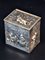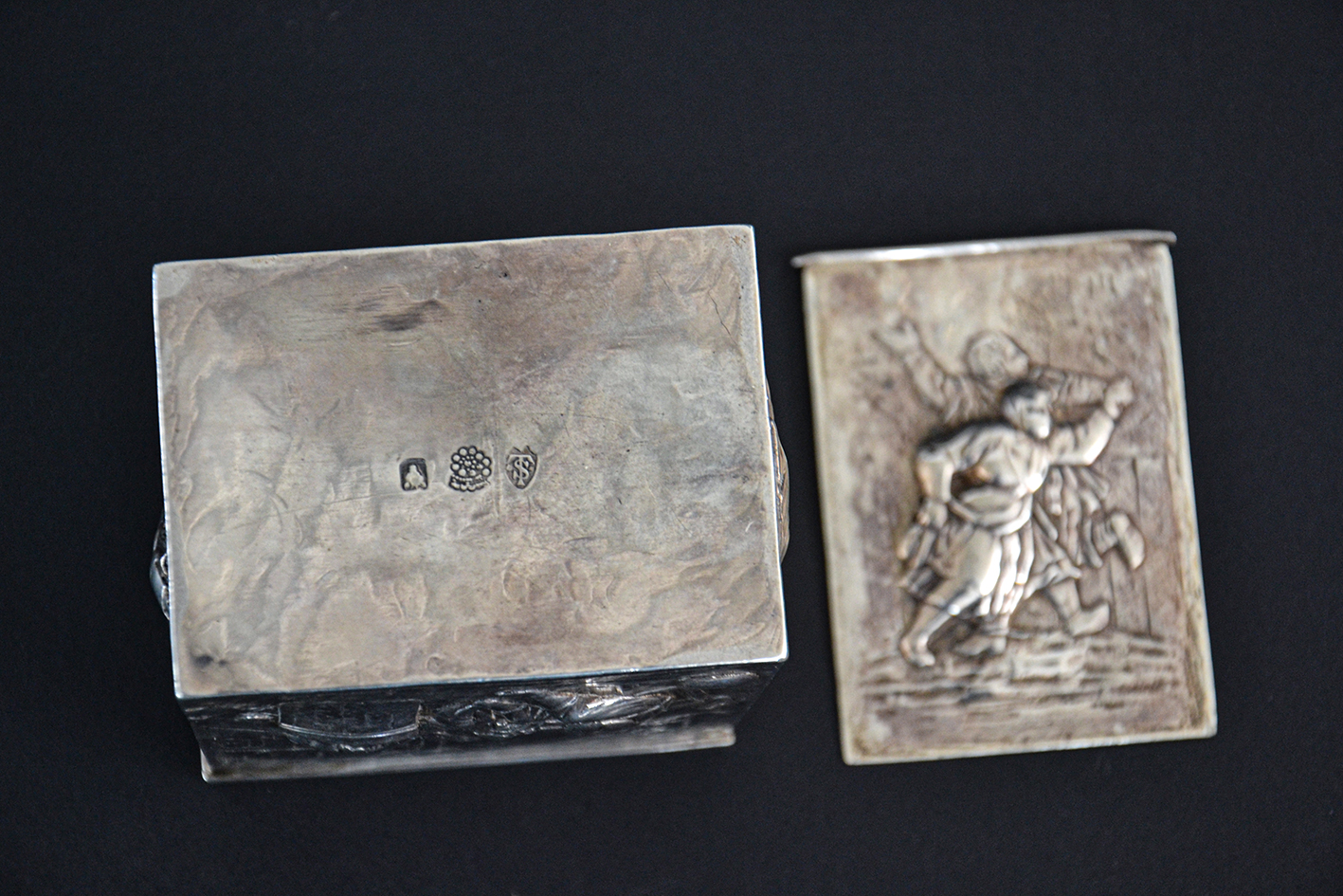 Tea box in argento sbalzato e cesellato, il coperchio si apre a slitta e sulle parti visibili sono rappresentate