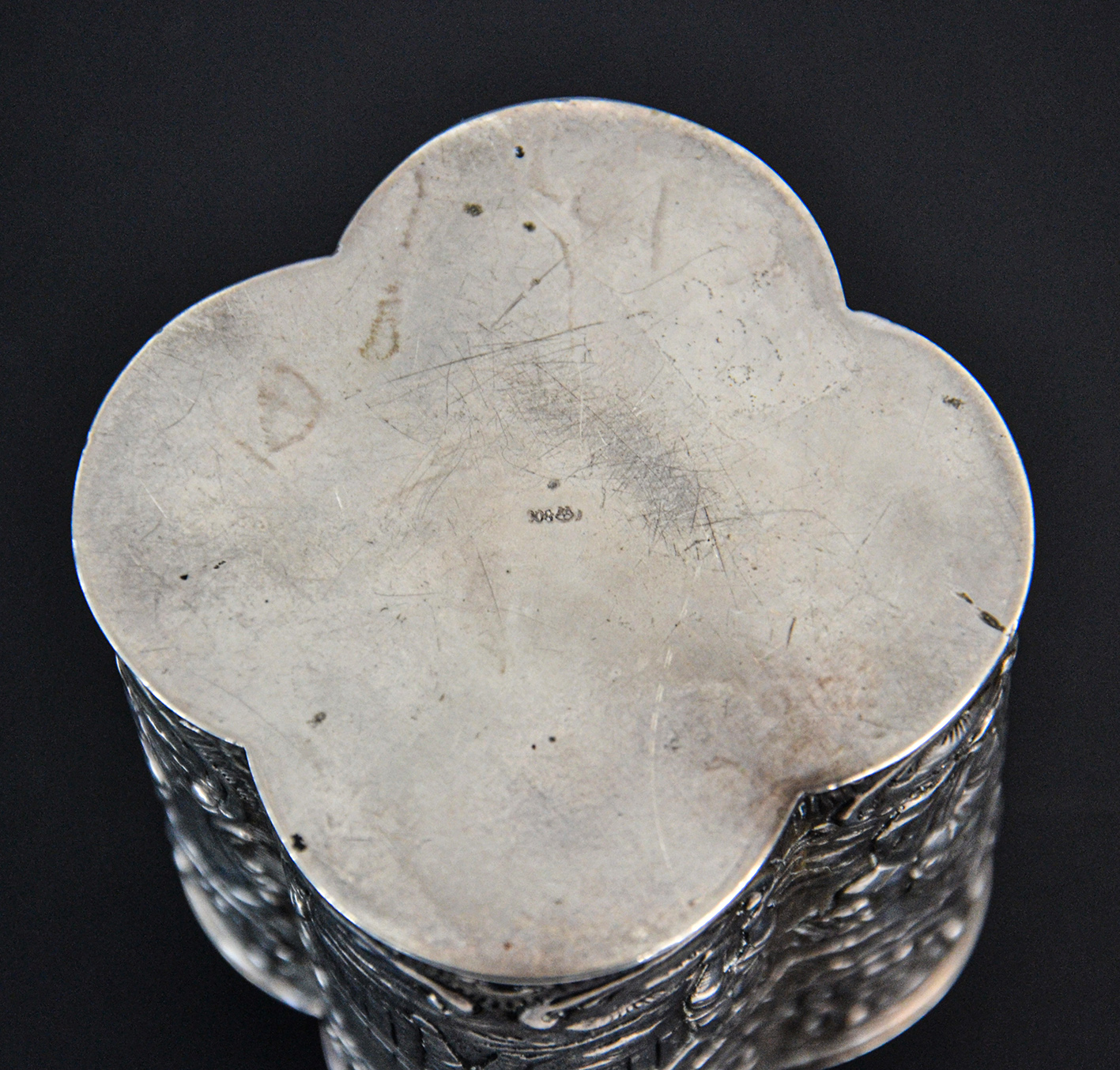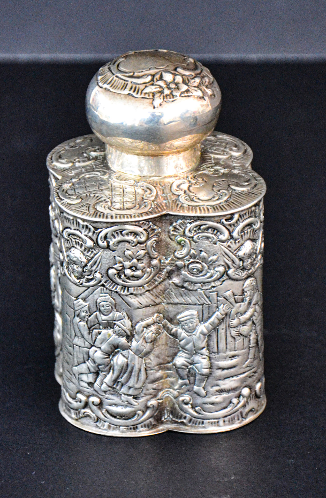 Tea Box in argento sbalzato e cesellato, contenitore a corpo tetra lobato su cui sono rappresentate scene