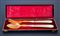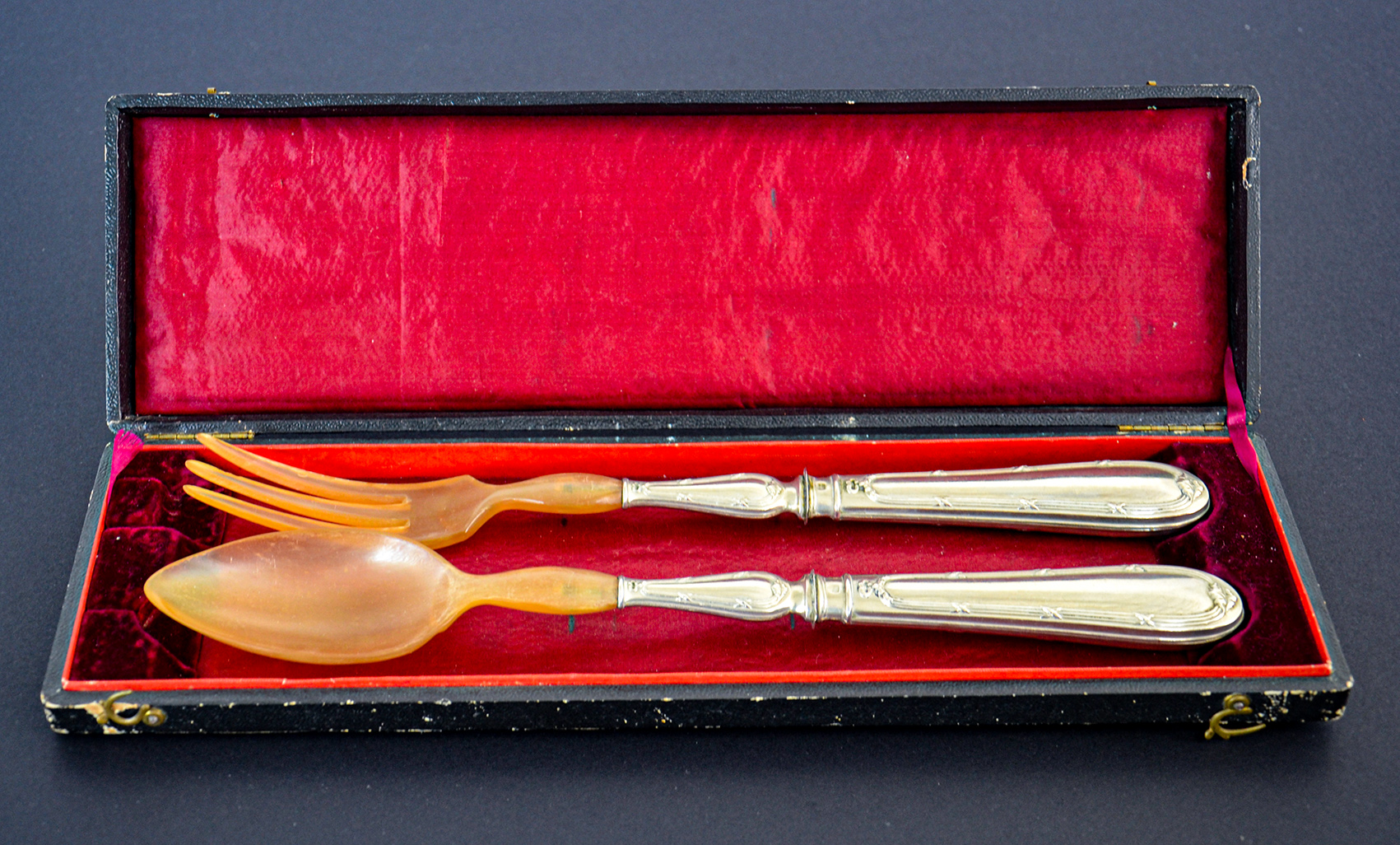 Antica coppia di posate da insalata, cucchiaio e forchetta in corno con eleganti manici in argento sbalzato, conservate nella loro custodia originale.