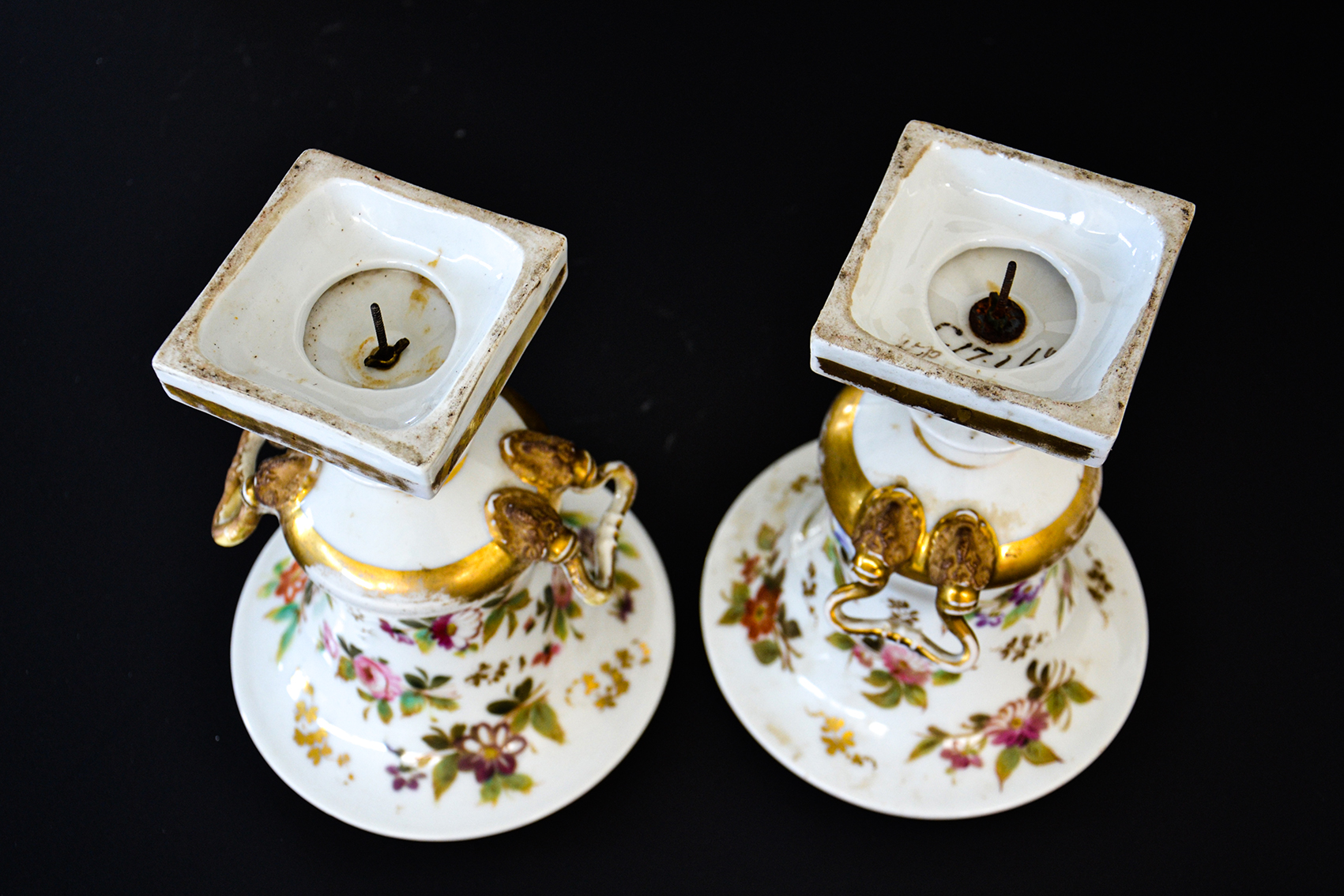 Lotto composto da n° 2 coppe in ceramica, stile impero Luigi XI, dipinte a mano con decoro floreale e oro zecchino su fondo bianco. Manici zoomorfi.