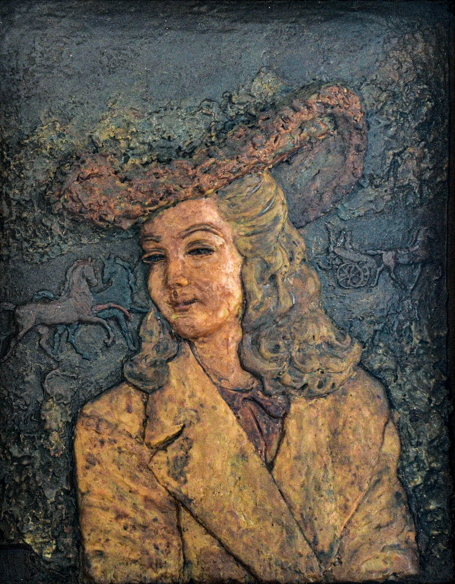 Opera raffigurante il ritratto di una dama ferrarese su fondo istoriato, si presenta come un altorilievo in cera colorata cm 62x50.