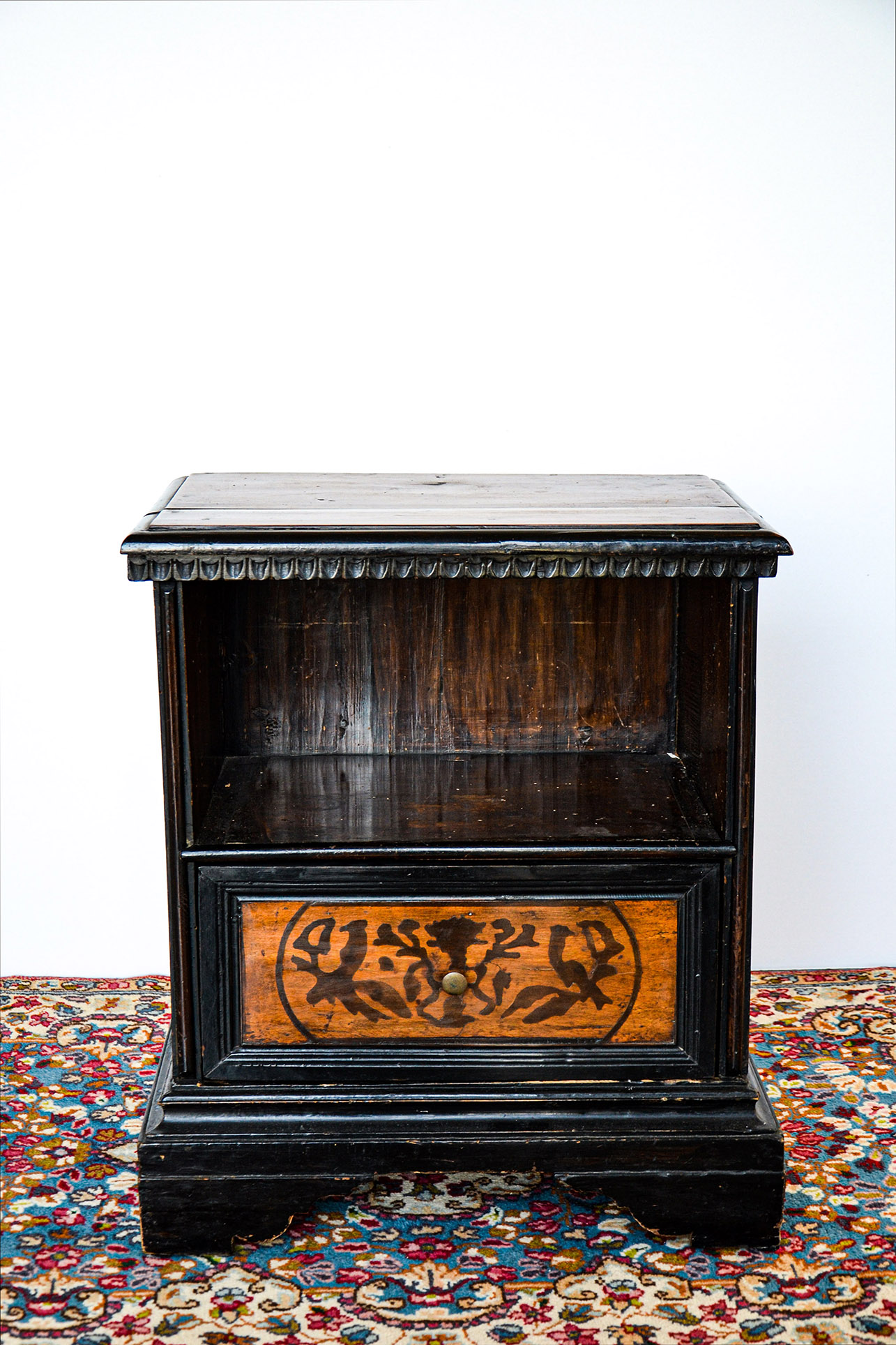 Mobiletto in legno massello tinto noce con bordi ebanizzati e cassetto decorato a mano con motivo floreale.