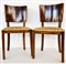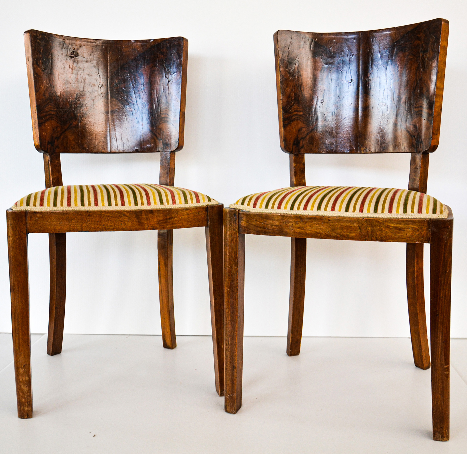 Coppia di sedie di manifattura italiana in legno impiallacciato con radica di noce, imbottitura con cinghia a molle, tappezzeria non coeva.