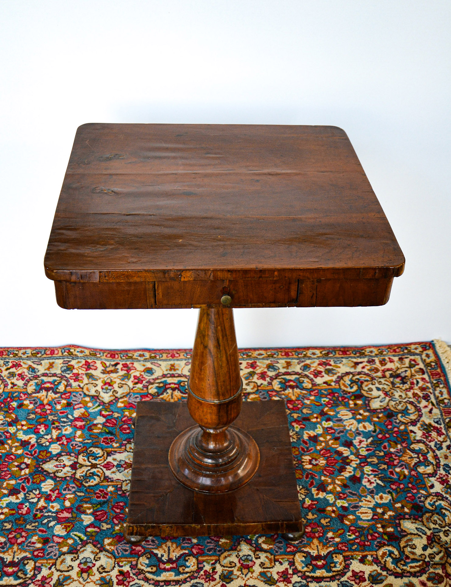 Tavolino ferrarese in noce lastronato con lungo cassetto suddiviso a scomparti.