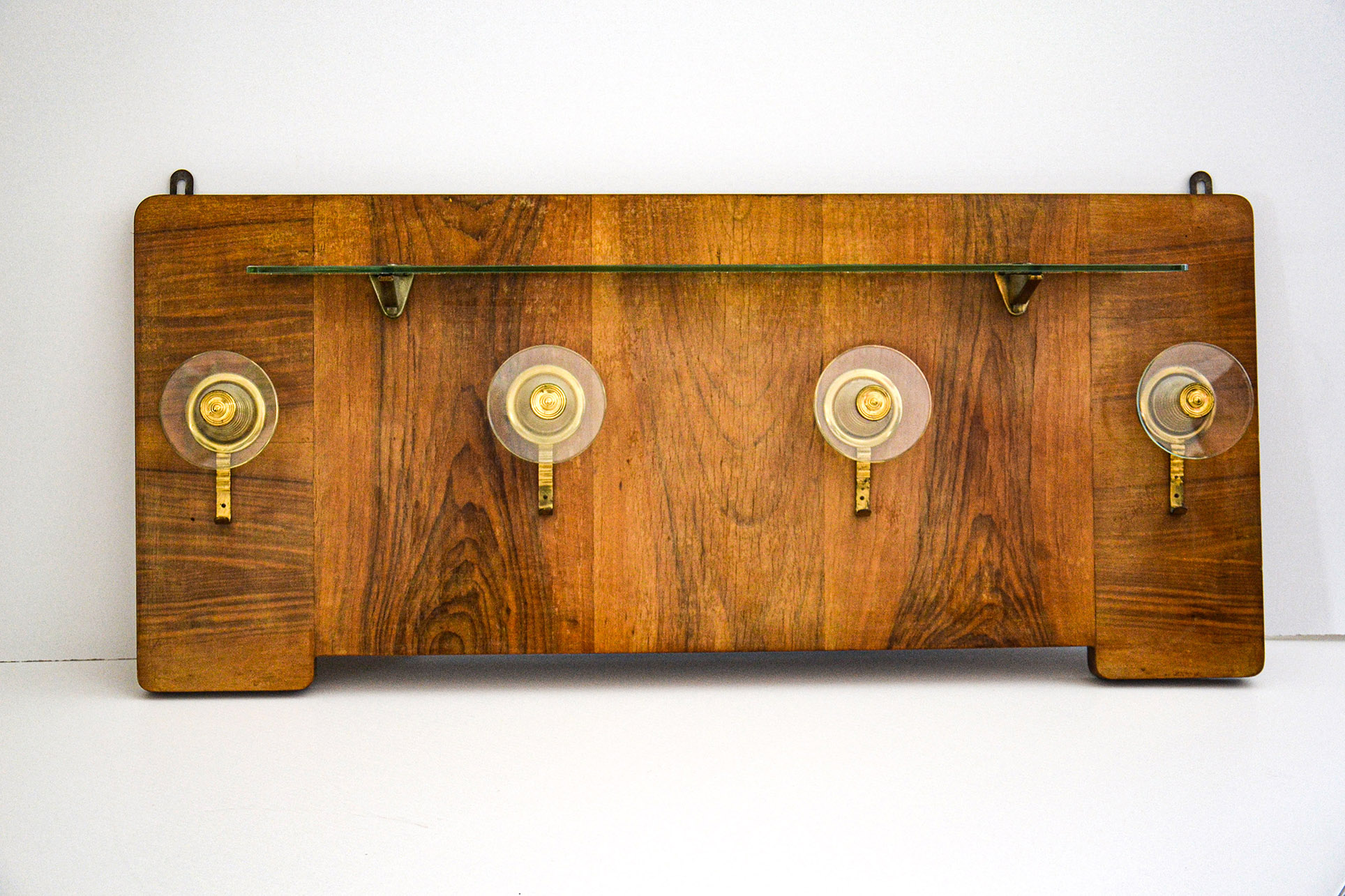 Attaccapanni in legno con impiallicciatura in noce nazionale, mensolina in vetro, pomolo in vetro e ottone.