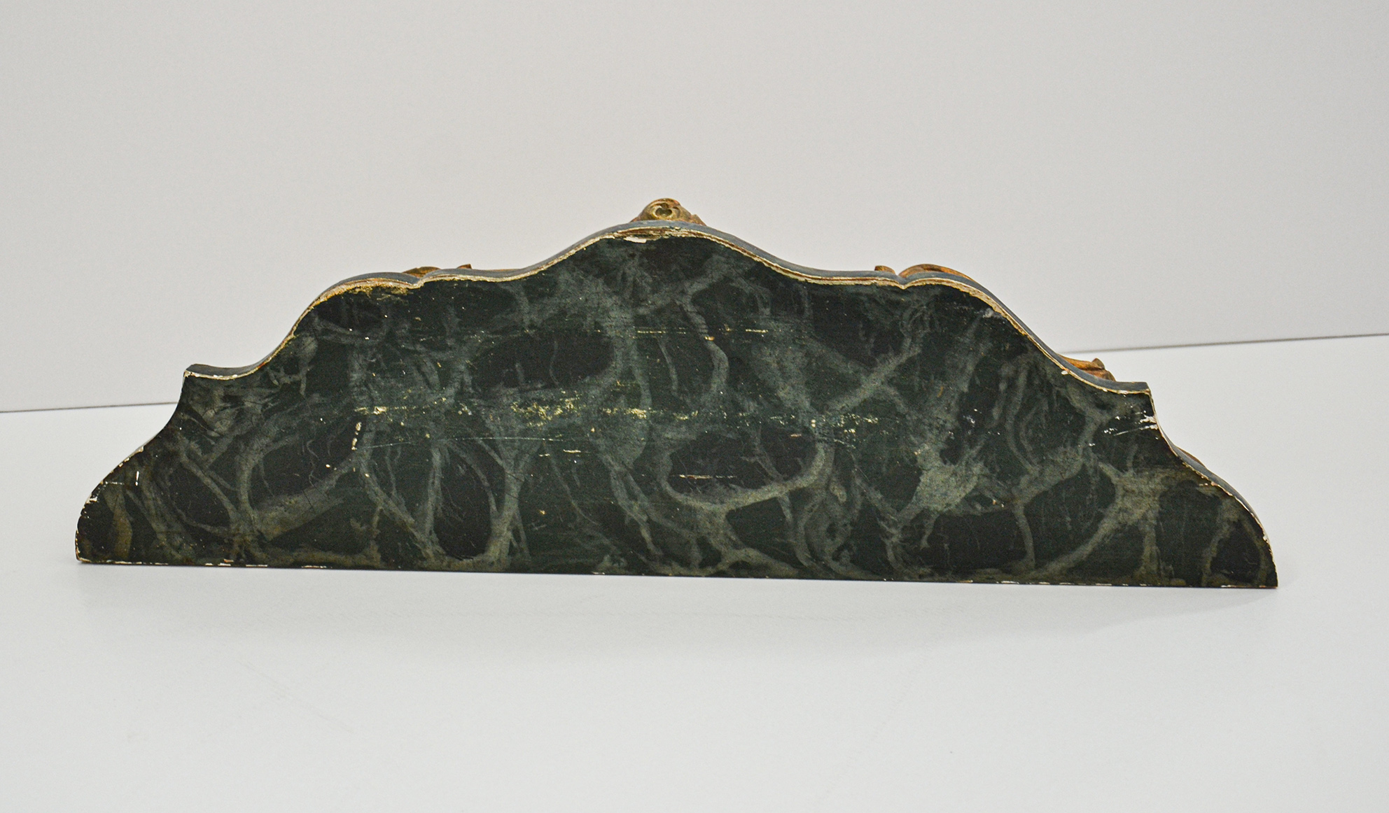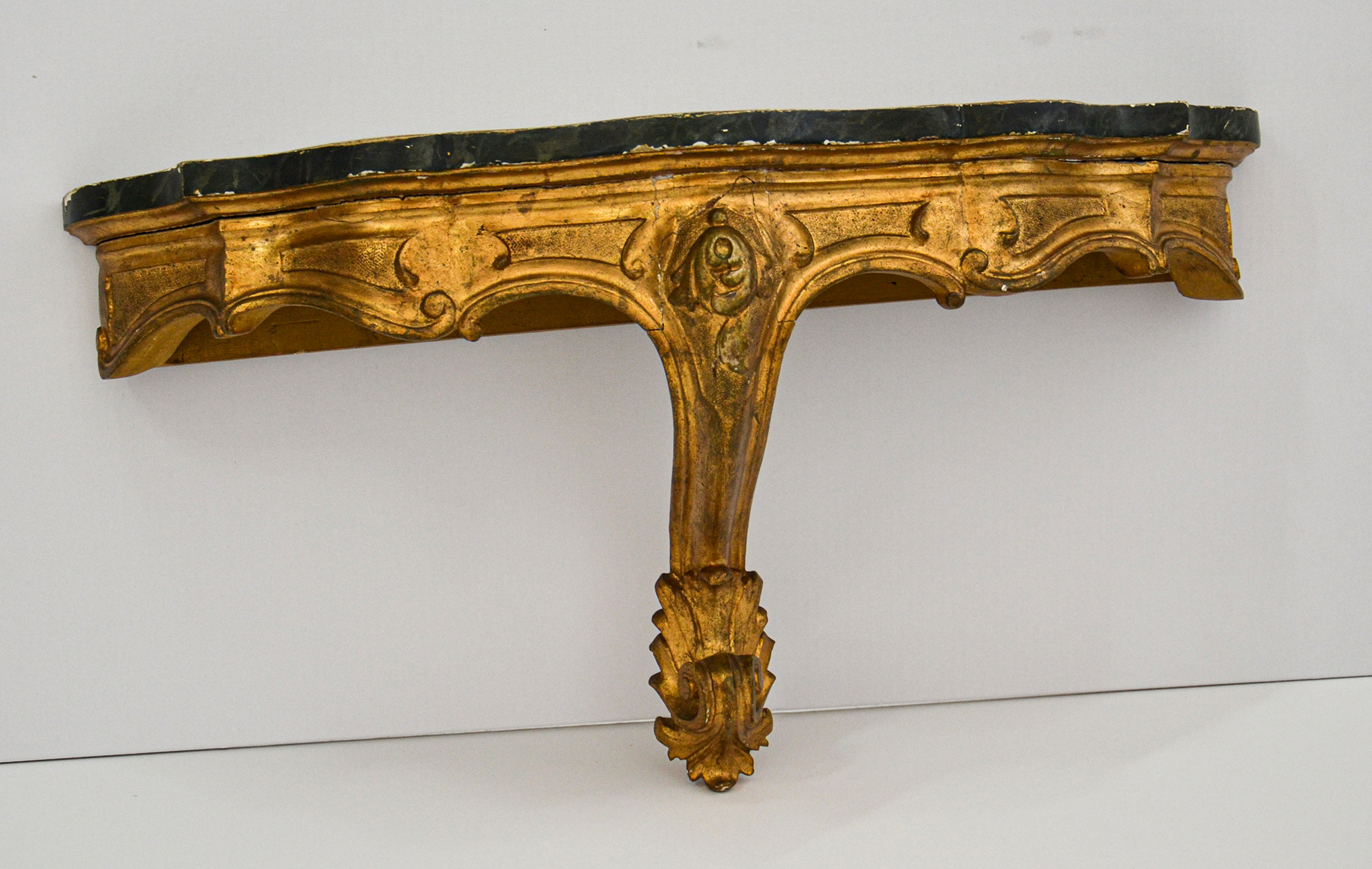 Mensola in legno massello con piano dipinto con effetto marmorino verde, gamba e cintura lavorate in stile barocco con finitura oro porporino.