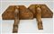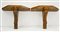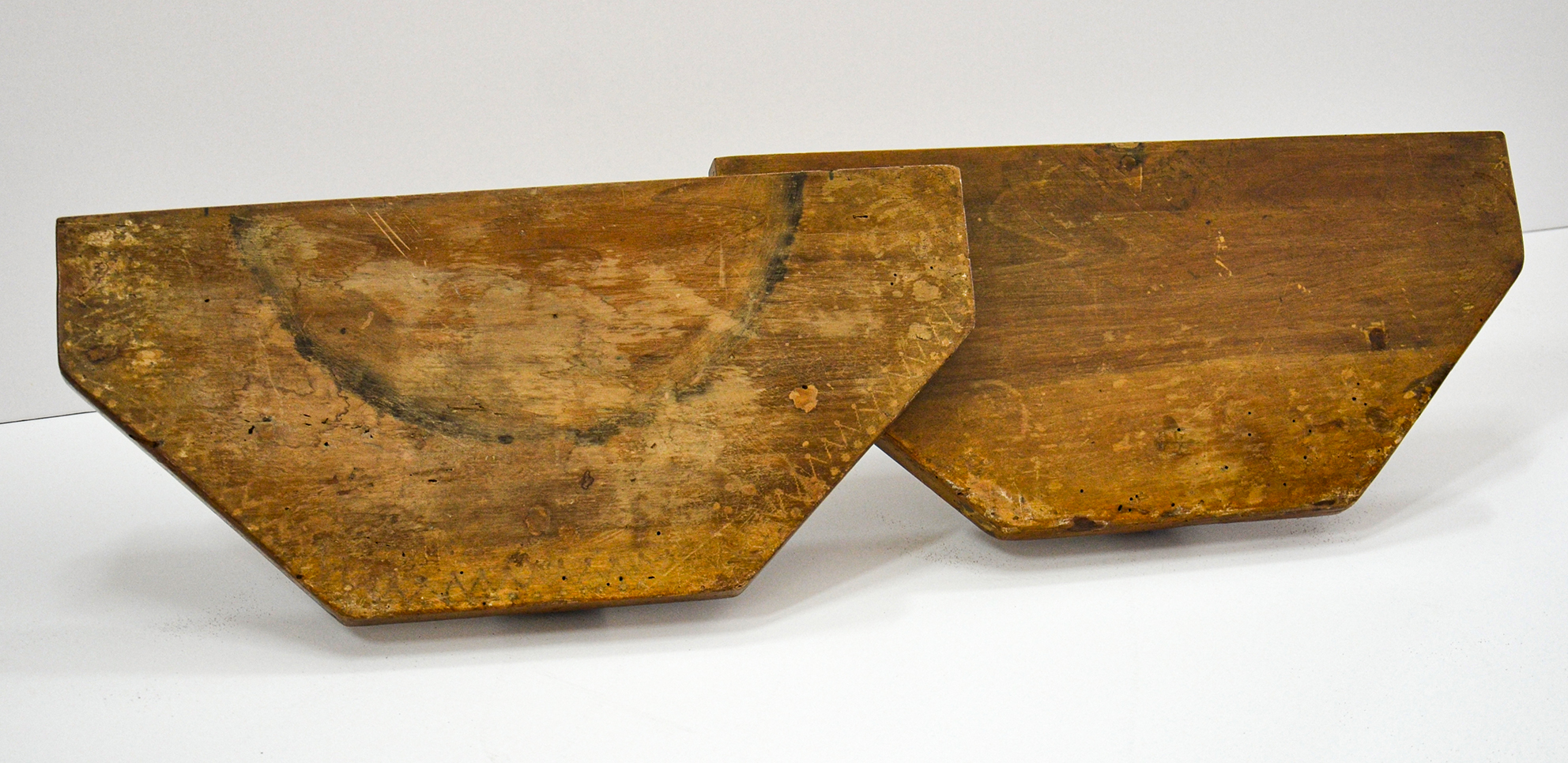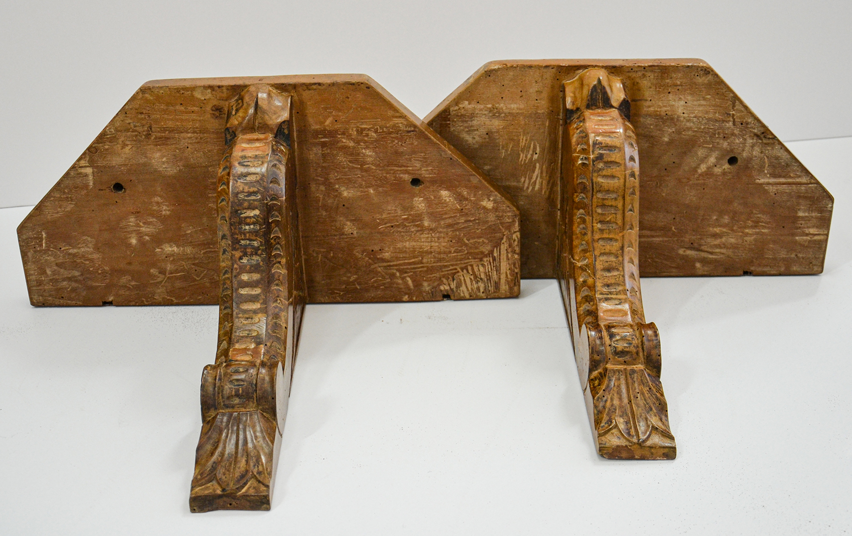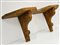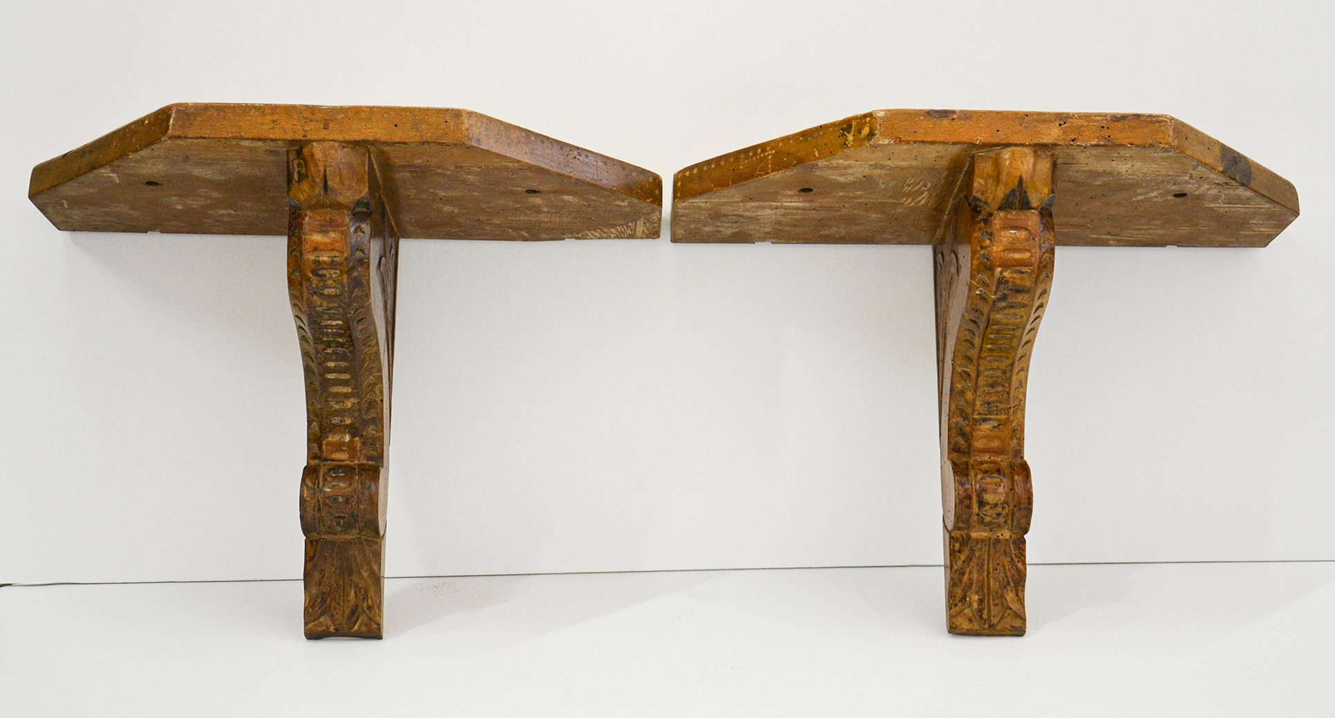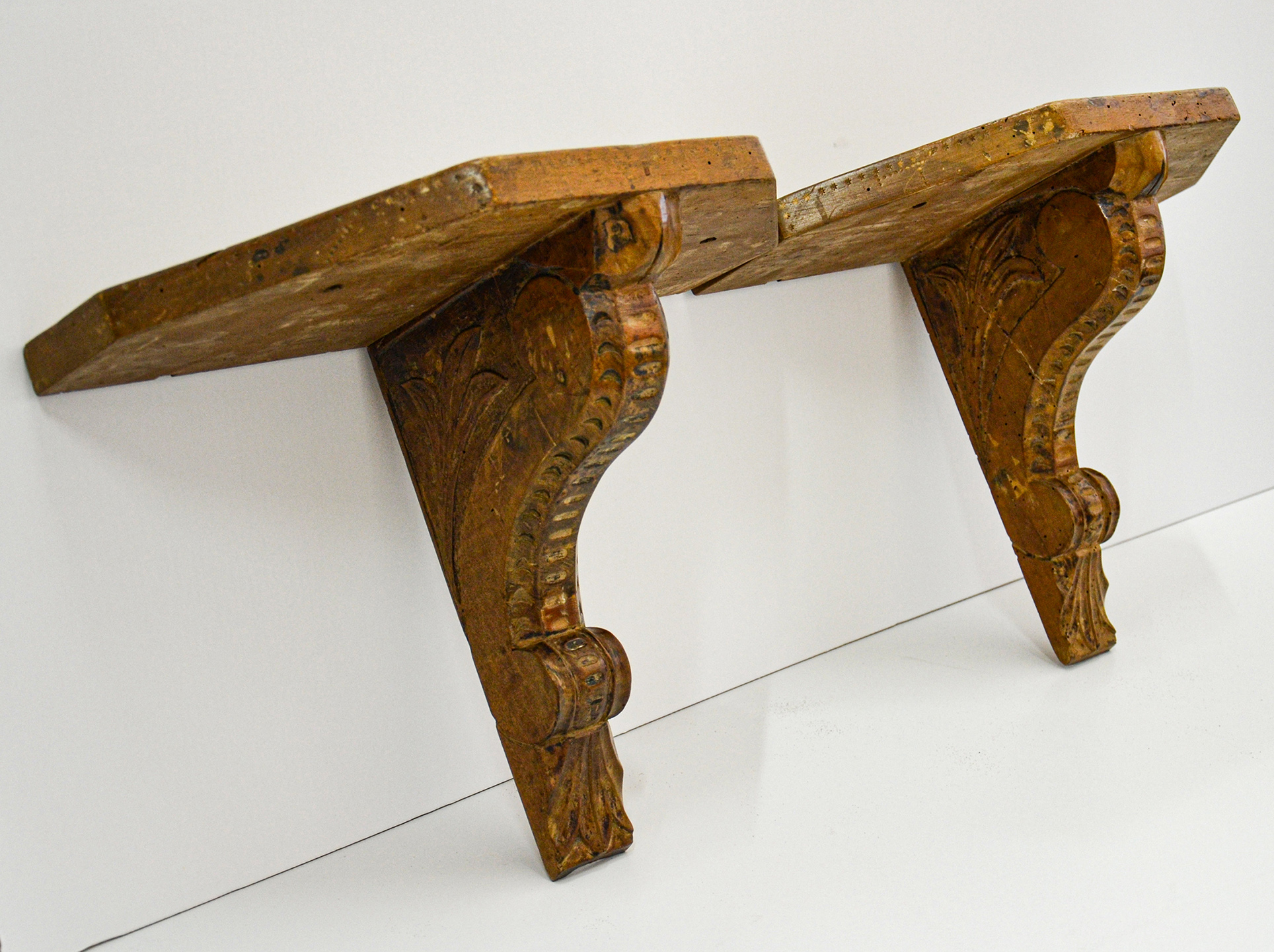 Lotto composto da due mensole in legno massello con piano a forma trapezioidale e gamba scolpita con ornamenti floreali.