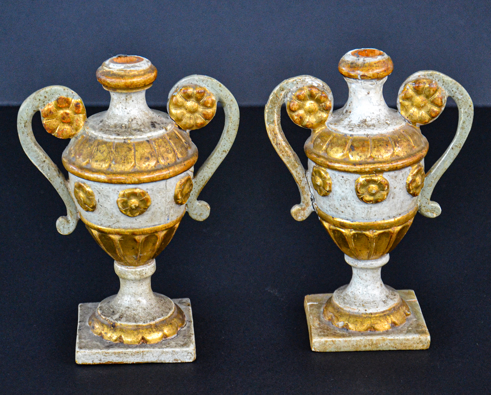 Porta candele a forma di vasi con anse, presentano una fascia dentellata nella parte superiore, una decorazione a fiori nel fusto centrale e un motivo a foglie alla base.