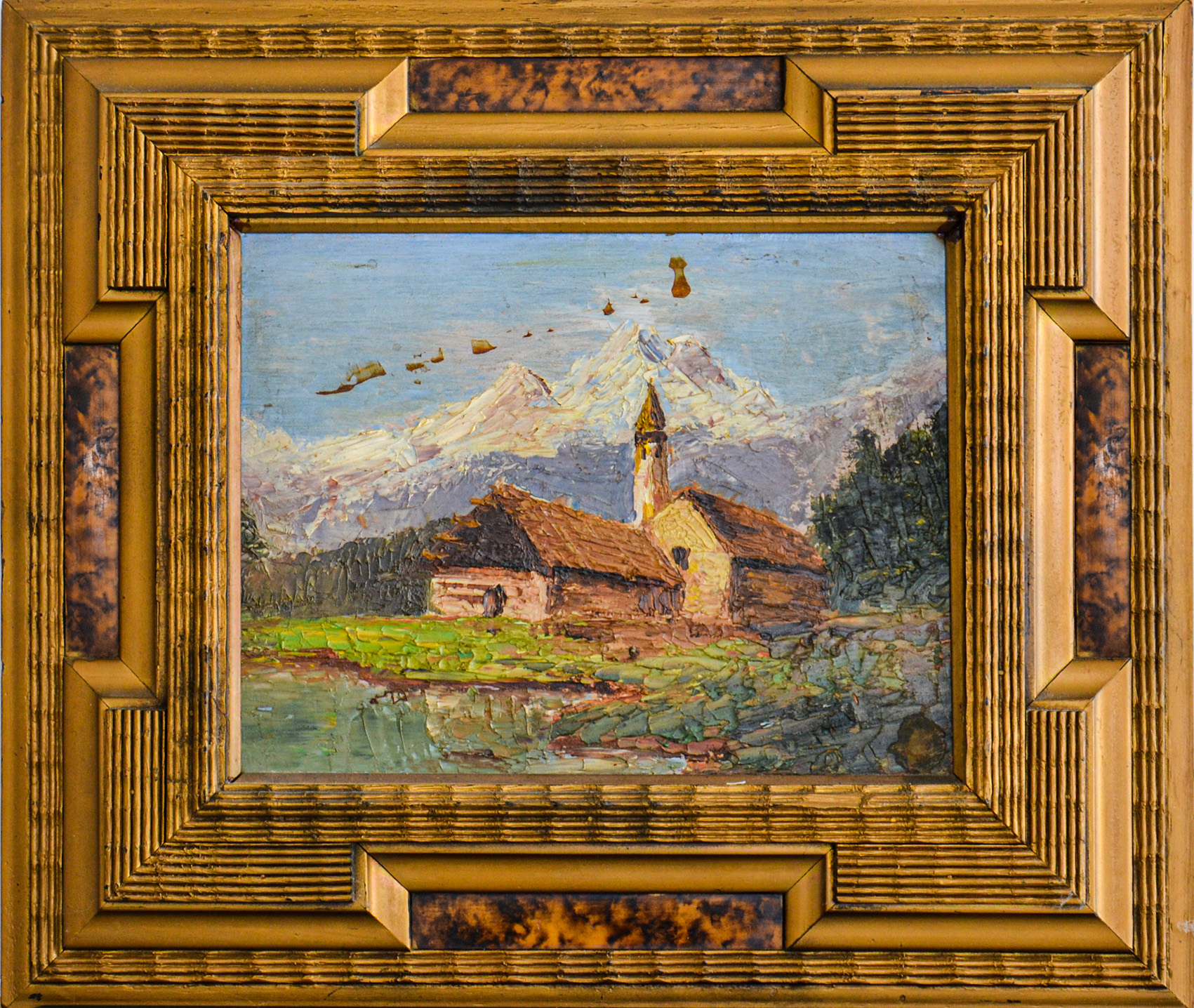 Opera con importante cornice dorata, intagliata e con inserti in radica.