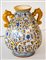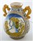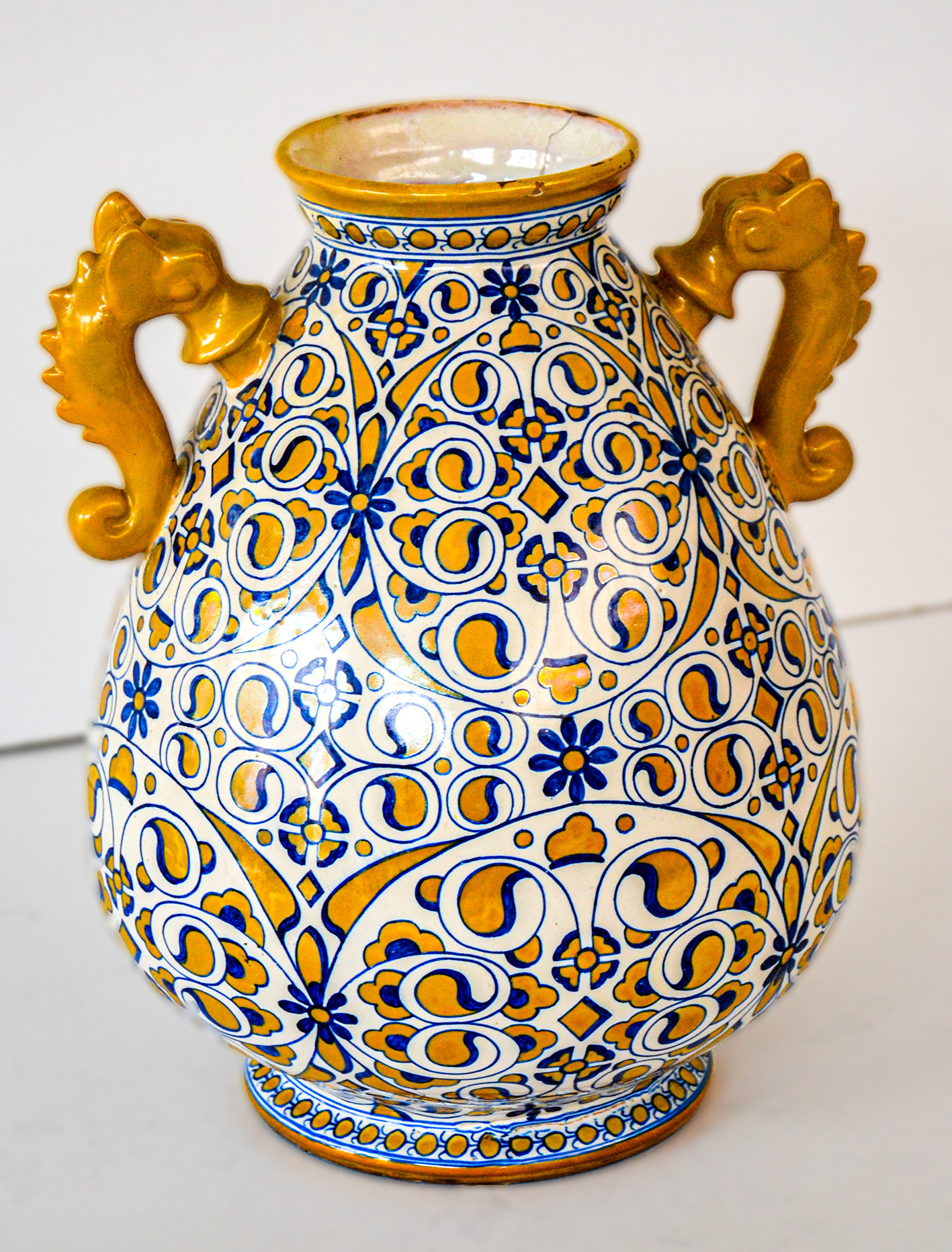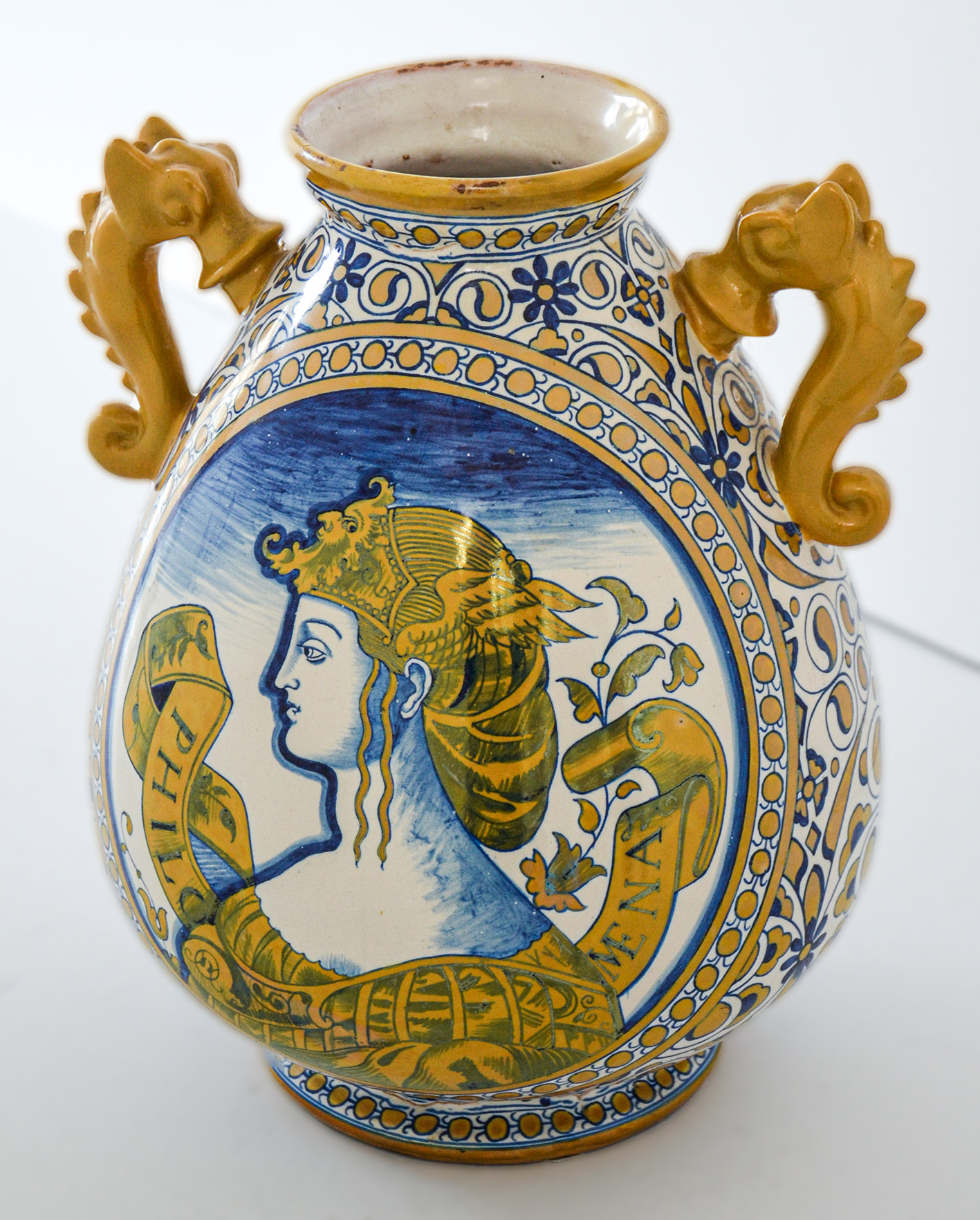 Vaso in maiolica piriforme con due anse a forma di ippocampi decorato in blu e lustro oro nello stile del primo Cinquecento di Deruta. Sul fronte medaglione con figura femminile di profilo incorniciata da infiorescenze, inoltre cartiglio con scritta "Philomena". Il resto della superficie è ad arabeschi.