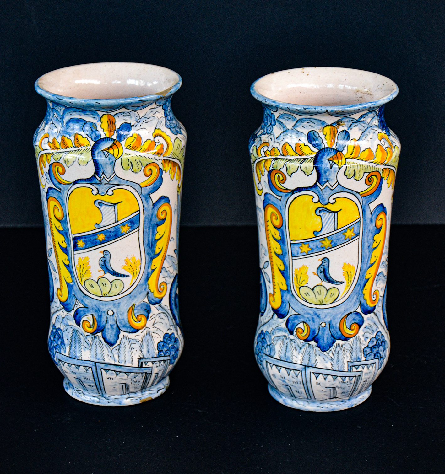L’albarello reca al centro un medaglione incorniciato da cartiglio con stemma nobiliare contornato da paesaggio agreste e immagini zoomorfe.