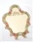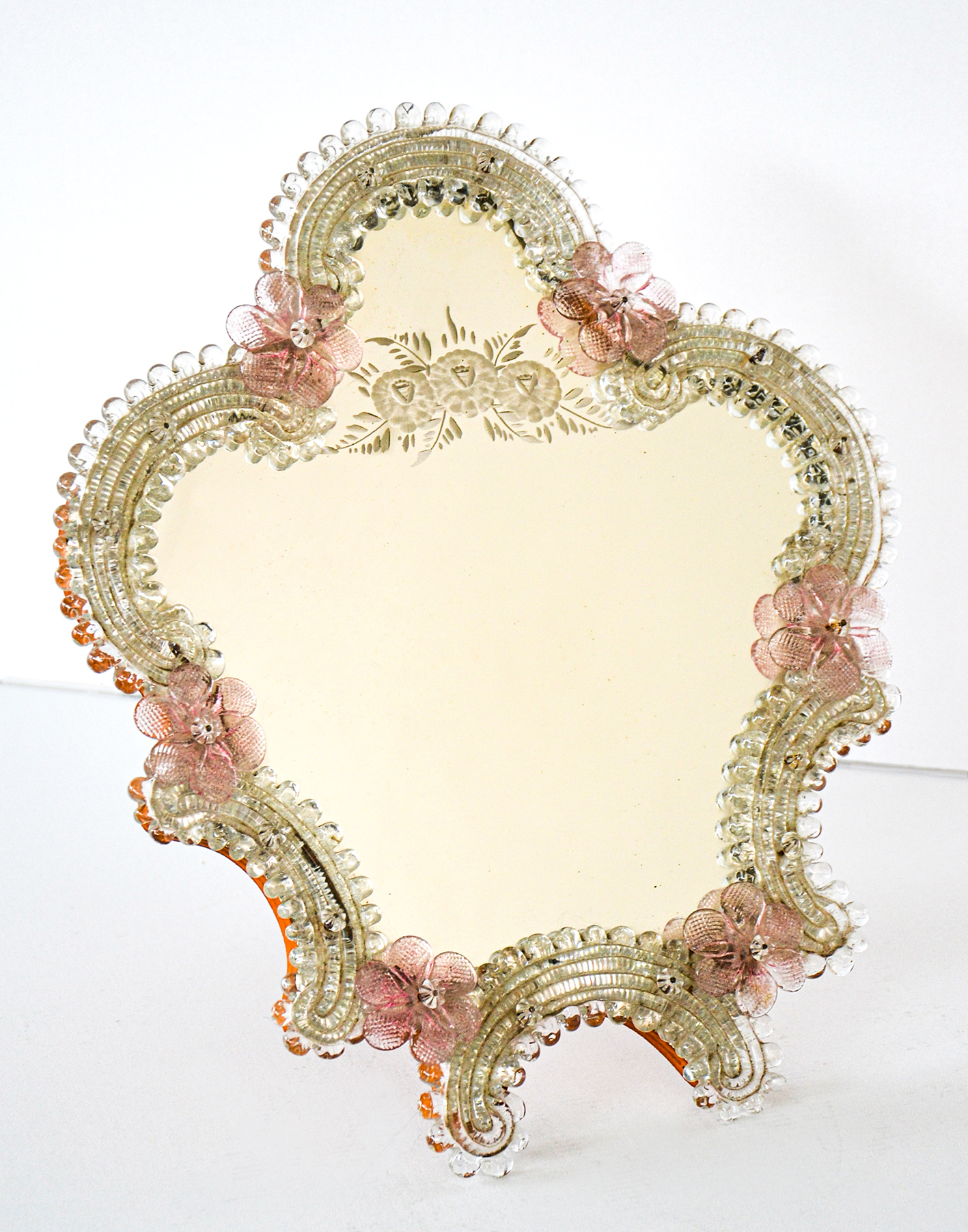 Specchio con cornice in vetro soffiato con decoro floreale in bianco e rosa.