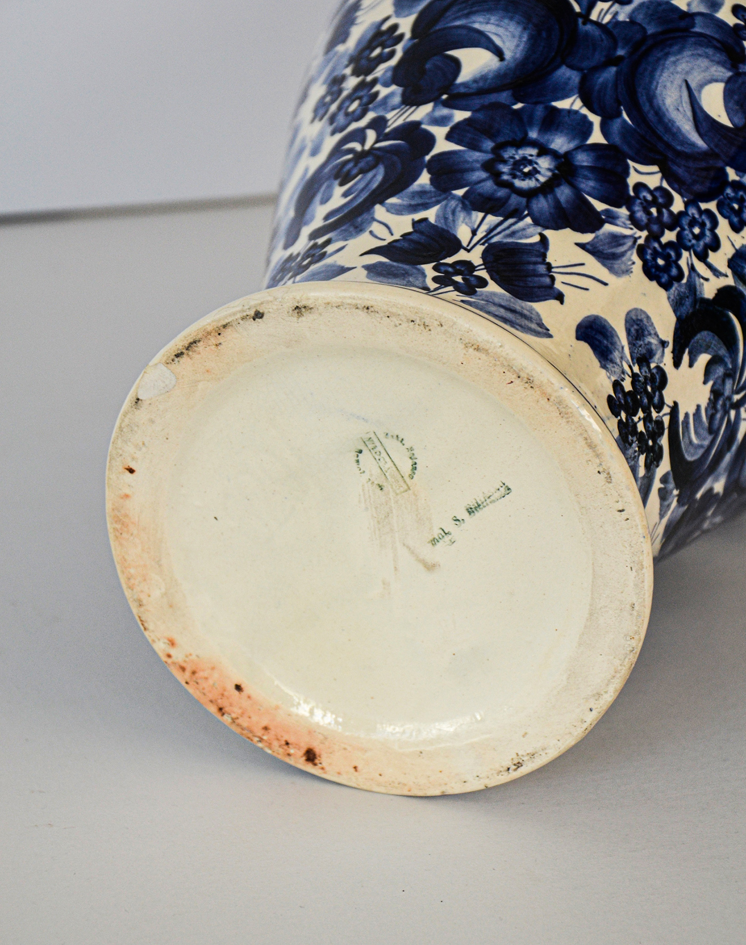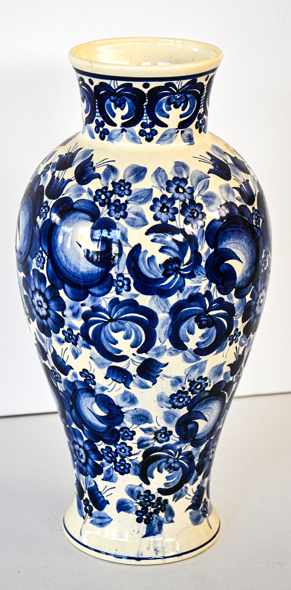 Vaso in ceramica bianca dipinto a mano con motivi floreali blu in stile folk.