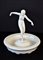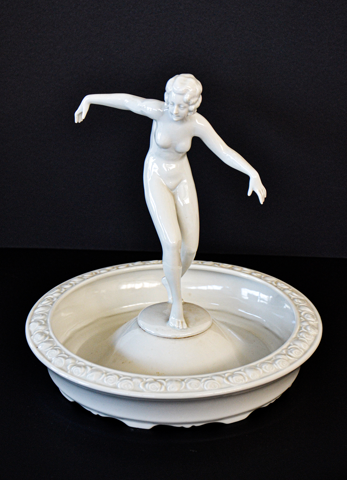 Ciotola in ceramica bianca smaltata, bordo decorato con rose in bassorilievo e figura centrale femminile in stile Art Decò.