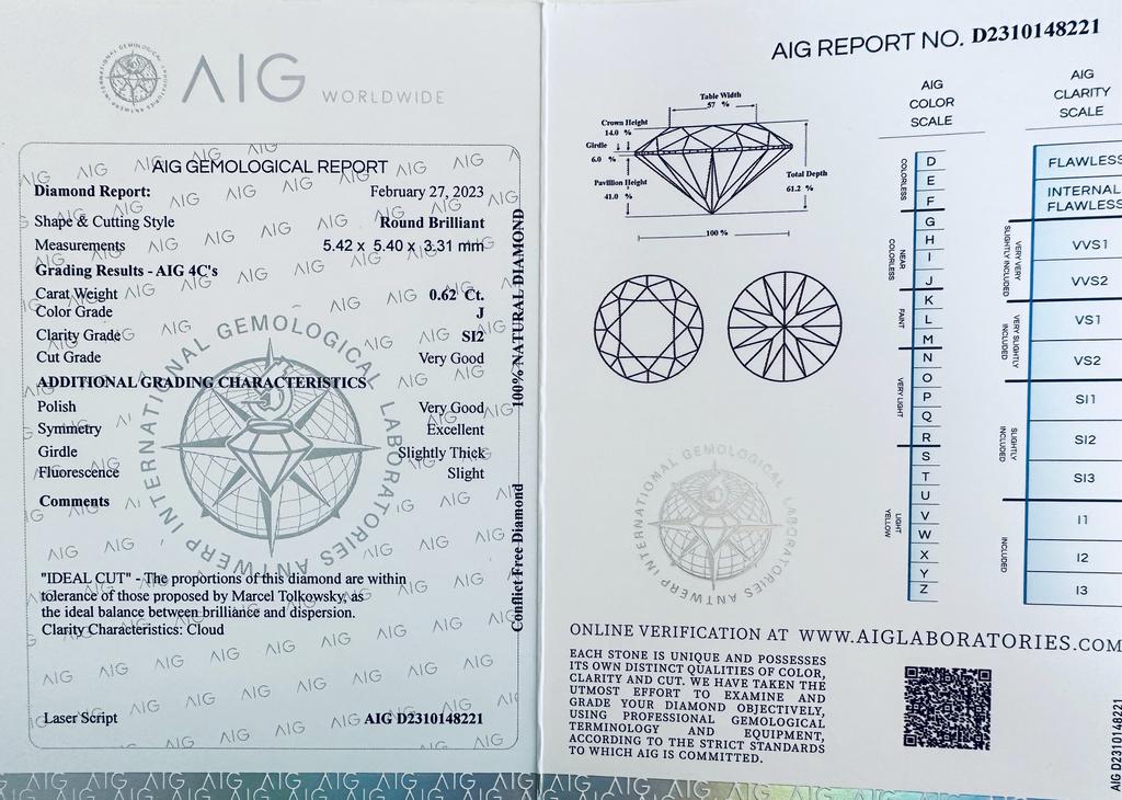 DIAMANTE 0,62 CT COLORE J PUREZZA SI2 - TAGLIO BRILLANTE - CERTIFICATO AIG + INCISO AL LASER - C30220-23
