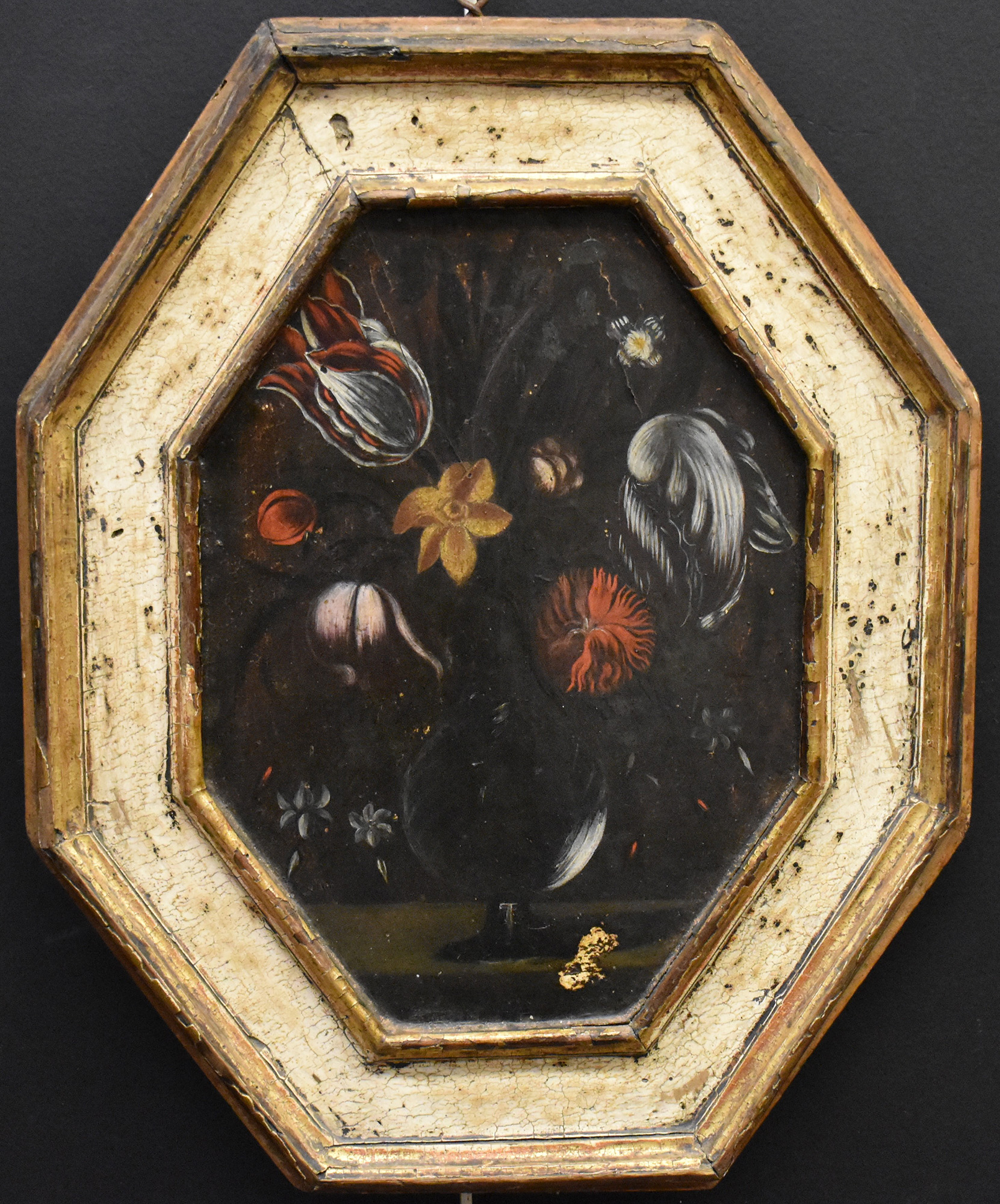 olio su tavola ottagonale 'vaso di fiori' cornice lacca e oro inglobata sec.XVIII
