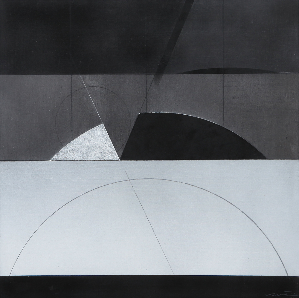 WALTER VALENTINI Pergola (Ps) 22/10/1928 Incontro con Checco, 1974 olio su tela cm. 50x50, firma, titolo e anno al retro, dichiarazione d'autenticità dell'artista su foto.