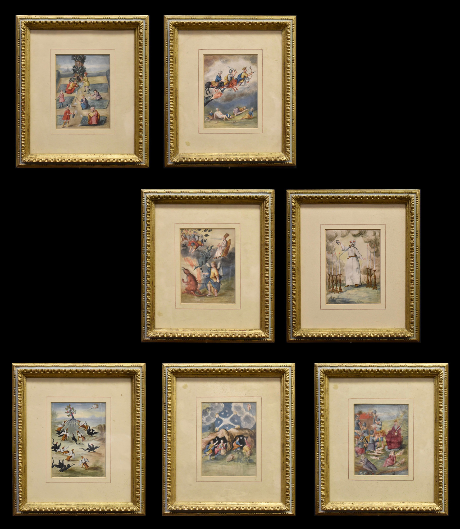 Precedente Lotto 0157 Successivo Casa d'Aste Martini - C.so Cavallotti 76, 18038 Sanremo Asta 82 Sessione unica giovedì 23 marzo 2023 ore 15:00 (UTC +01:00) DIPINTO n.7 tempere a soggetto esotericocm. 19x14