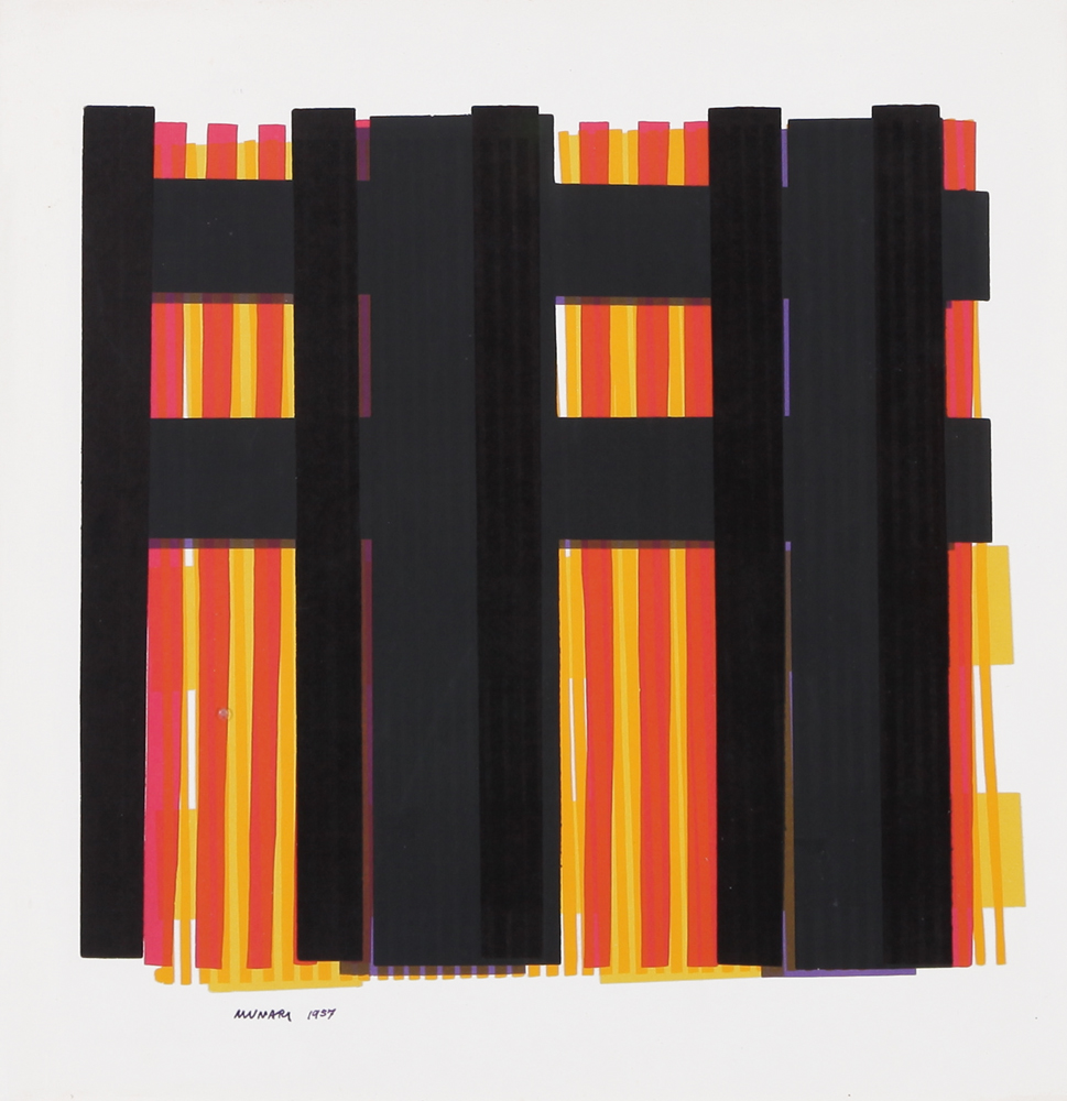 BRUNO MUNARI Milano 1907 - Milano 30/09/1998 Senza titolo, 1957 tempera su carta cm. 36x35, firma e anno in basso a sinistra.