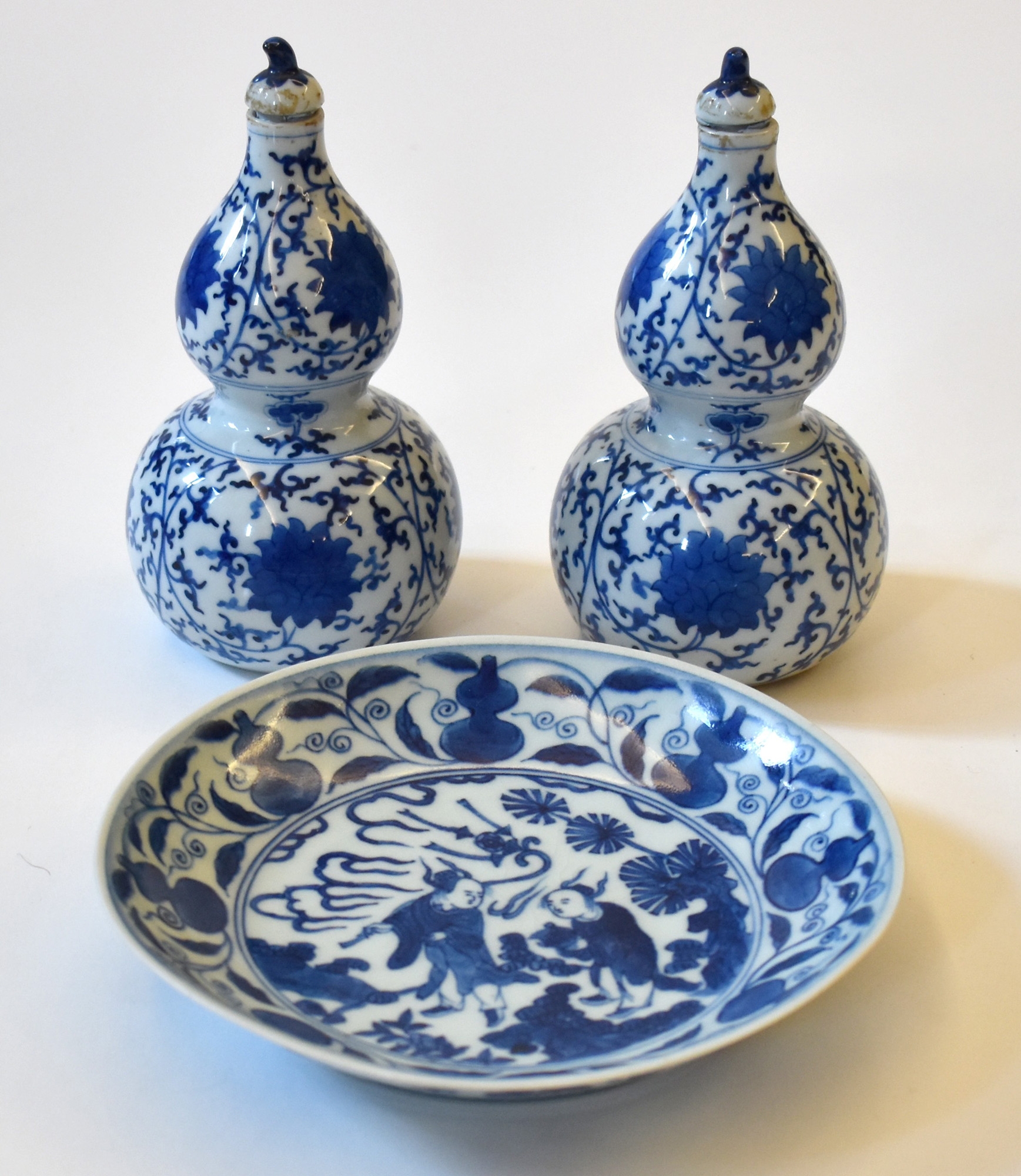 Cina coppia di vasi in porcellana bianca e blu a forma di zucca h 16 + piattino dm 17 4 cm
