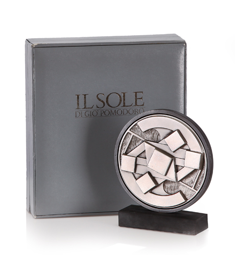 GIO POMODORO Orciano di Pesaro 1930 - Milano 21/12/2002 Il sole scultura, multiplo in argento titolo 1000 cm. 14x12x3,5; esemplare numero 56 (tiratura totale non specificata), firma sulla destra, punzoni dell'argentiere S. Johnson sulla sinistra, entro custodia originale.